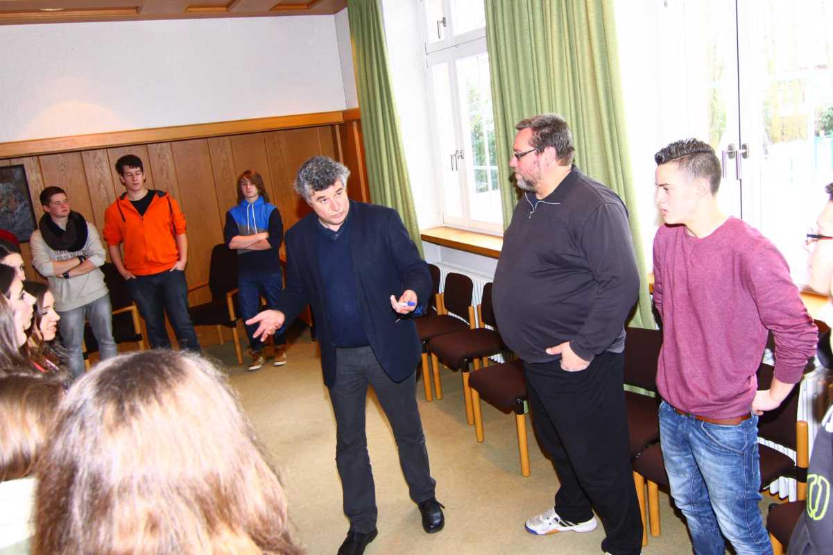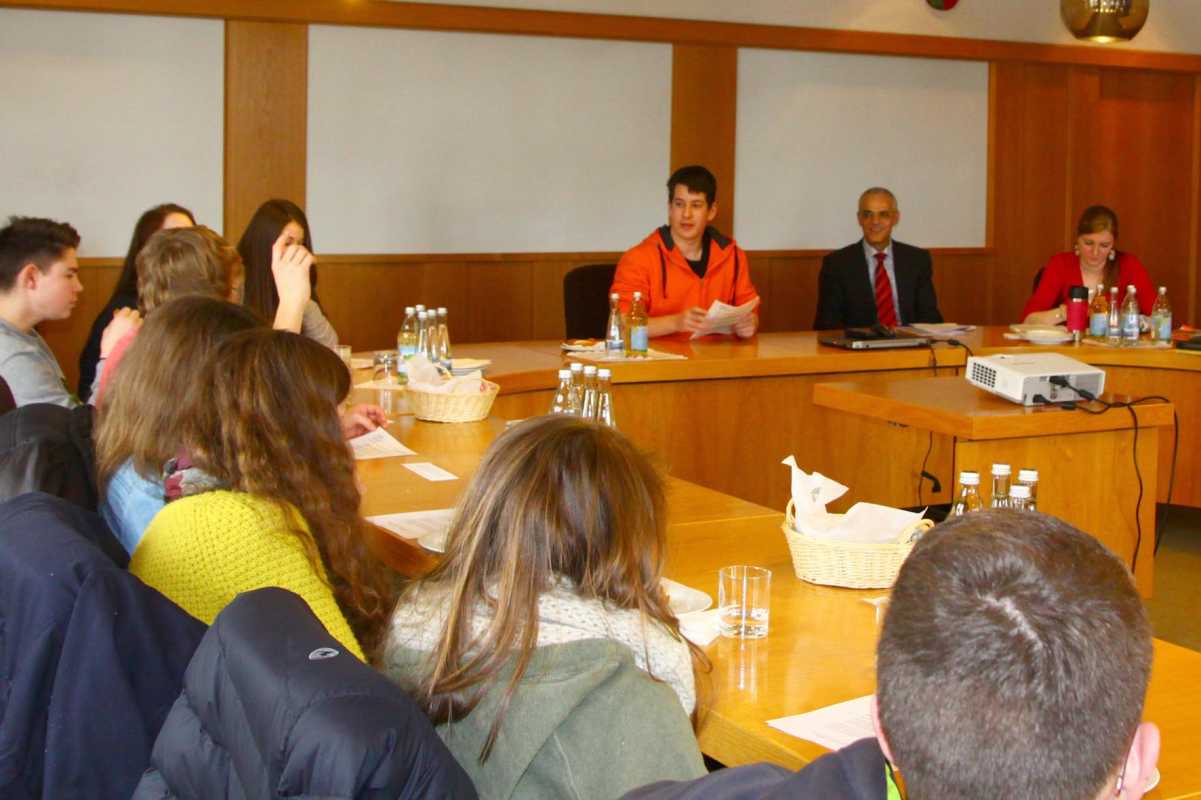 Auch ansonsten war alles realistisch: Das Planspiel wurde im Sitzungssaal des Rathauses abgehalten, für die Räte gab es Brezeln, Saft und Wasser und selbst die geladene Presse wurde an ihre üblichen Stammplätze gebeten. Im Unterricht im Fächerverbund EWG (Erdkunde, Wirtschaftskunde, Gemeinschaftskunde) hatten sich die Schülerinnen und Schüler schon gut auf ihre Rollen als Gemeinderäte vorbereitet, so dass es zu Beginn der fiktiven Sitzung keine Fragen an Fritz Link, den realen Bürgermeister von Königsfeld, gab, der beide Workshops begleitete.