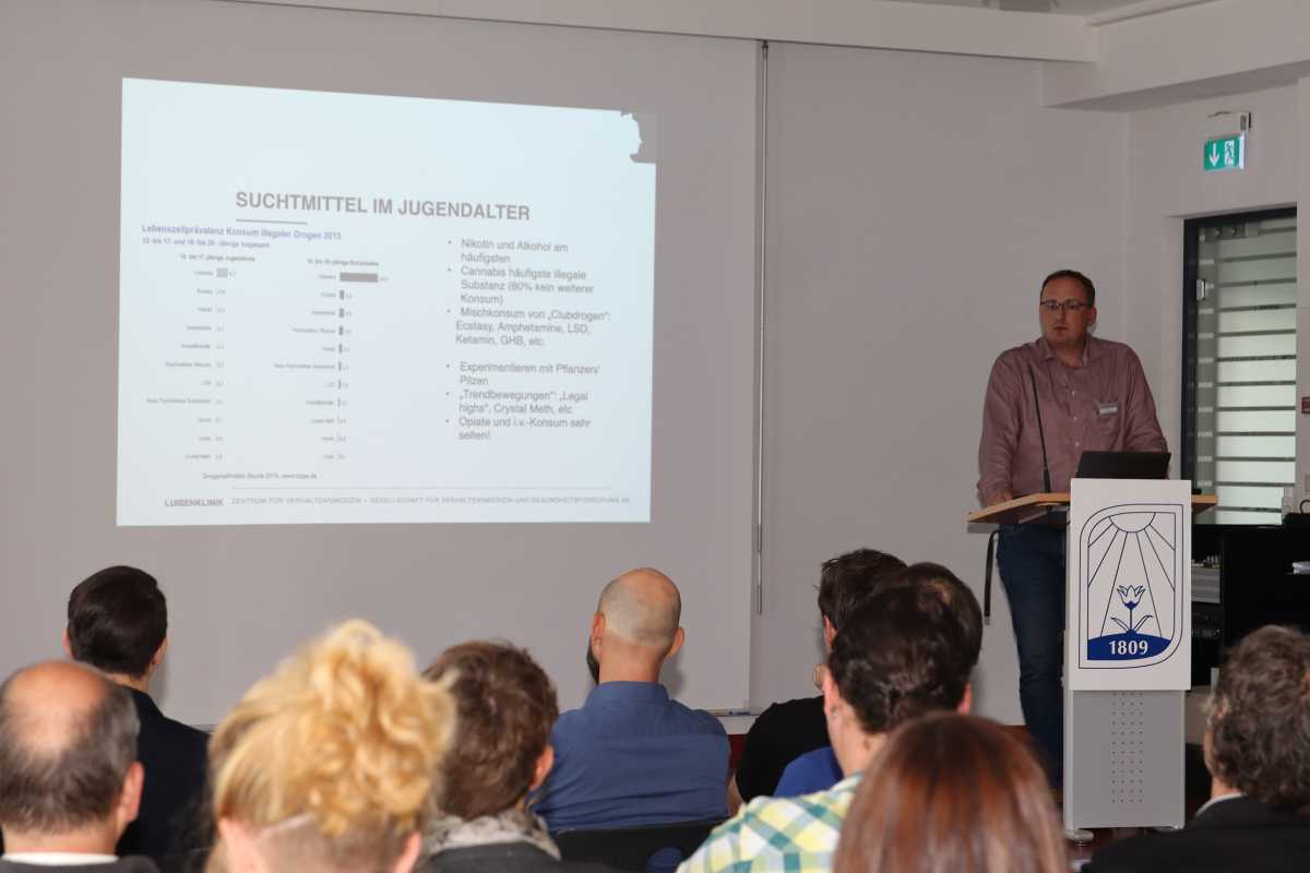 Nach einem Rundgang durch die Schule, einem gemeinsamen Mittagessen in der Mensa sowie der Besichtigung der Räumlichkeiten in beiden Häusern des Internats refertierte der leitende Oberarzt der Bad Dürrheimer Luisenklinik, Wolfgang Barth, über Substanzmittelmissbrauch und Sucht.