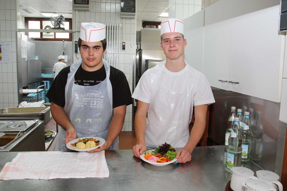 Die Deutsche Gesellschaft für Ernährung hatte unter dem Motto "Schule ist coolinarisch" zum siebenten Mal den bundesweiten Tag der Schulverpflegung ausgerufen. Auch die Zinzendorfschulen haben sich sehr engagiert daran beteiligt: Die Großküche hat nicht einfach nur die vorgeschlagenen Rezepte nachgekocht, die es an allen teilnehmenden Schulen gab - die Schüler durften sogar selbst den Kochlöffel schwingen. Das Küchenteam unter der Leitung von Küchenmeister Stefan Jung bekam von sechs Freiwilligen Unterstützung, zwei Schülern der Fachschule für Sozialpädagogik und vier Schülern aus der 9w, die im Fach Mensch und Umwelt (MuM) bereits die Hygieneverordnungen kennengelernt hatten. Sie kredenzten Kartoffelsuppe mit Meerrettich nach dem Rezept von Vincent Klink, nussige Pute mit Couscous, für die Vegetarier Spaghetti-Pizza, dazu gemischten Blattsalat und zum Nachtisch Obstsalat.„Unter meinem Mitschülern sind einige Vorurteile gegenüber der Küche im Umlauf“, sagt der angehende Erzieher Wolfgang Bergmann, der im Internat lebt und daher die kulinarische Vielfalt der Küche nicht nur mittags erlebt. Er wollte die Gelegenheit nutzen, selbst einen Blick hinter die Kulissen der Großküche zu werfen. „Heute konnte ich hautnah erleben, dass hier alles frisch zubereitet wird.“ Er hat Gemüse geschnippelt und angebraten, durfte die Speisen sogar würzen. „Na ja, und das Putzen im Anschluss gehört eben auch dazu.“ Seine Erfahrungen will er später auch mal in der Küche ausprobieren, in der die älteren Internatsbewohner sich abends selbst etwas kochen können.
