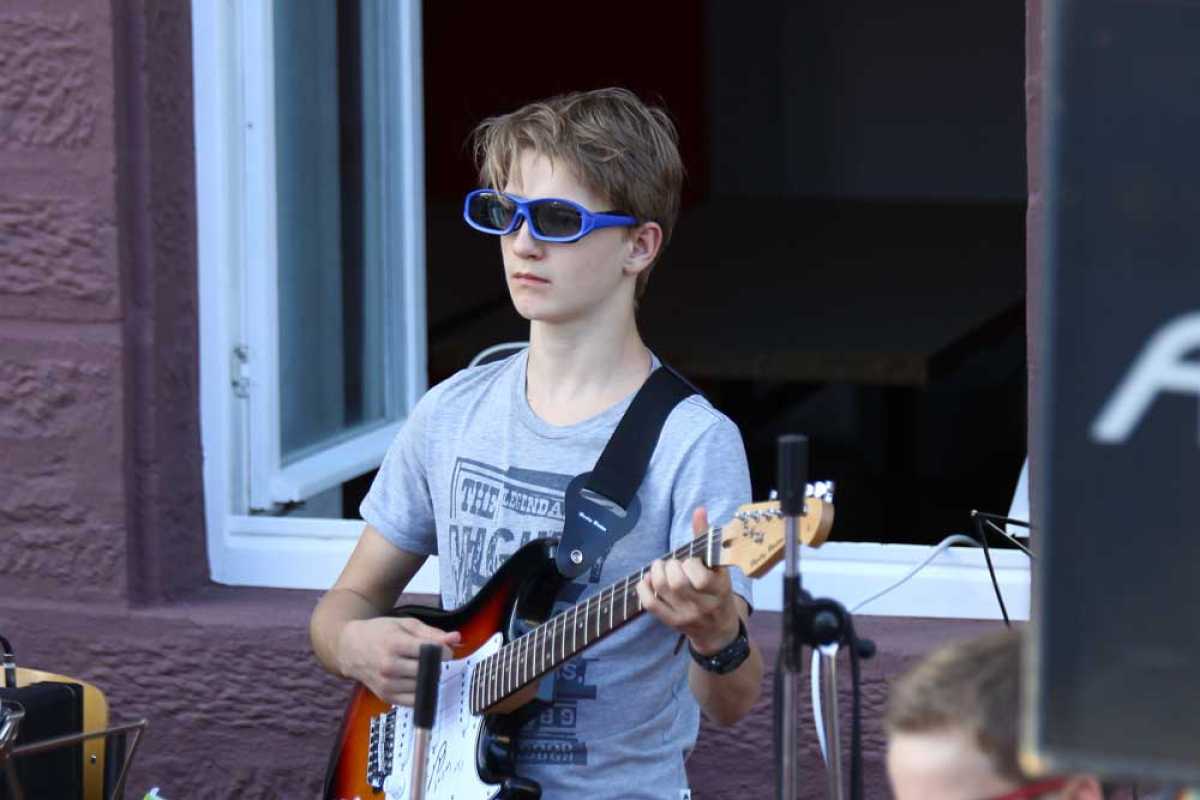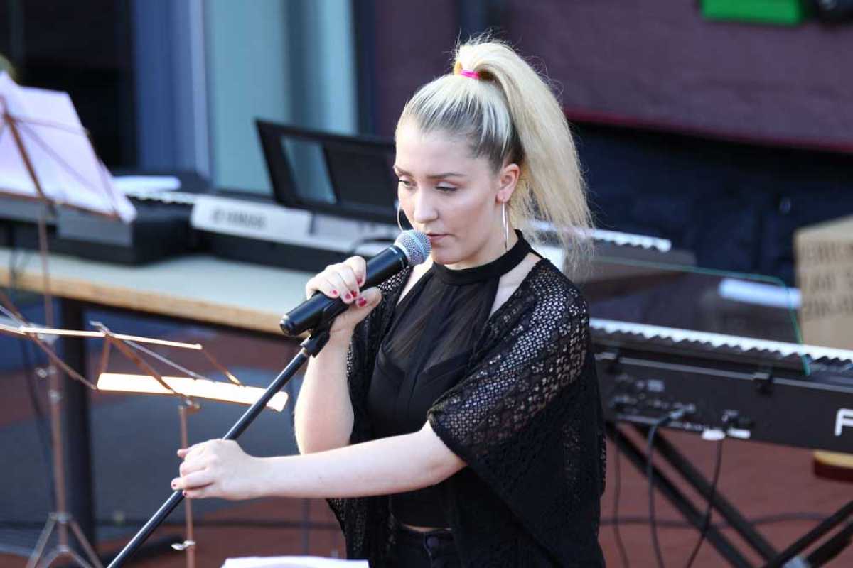 Auch zwei talentierte Solistinnen überraschten das Publikum: Donjeta Spahija trug in Begleitung von Hans Haller (Gitarre) zwei Stücke von Amy Winehouse und ein albanisches Lied vor, Silke Vogt - Preisträgerin von unter anderem Jugend Musiziert und dem Schooljam - begleitete sich selbst an der Gitarre bei George Erzras „Budapest“ und „Little Talks“ von der Band Of Monsters and Men.