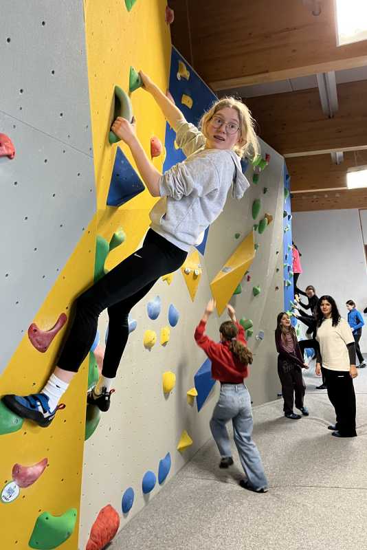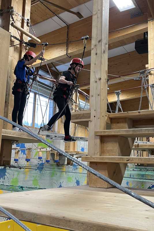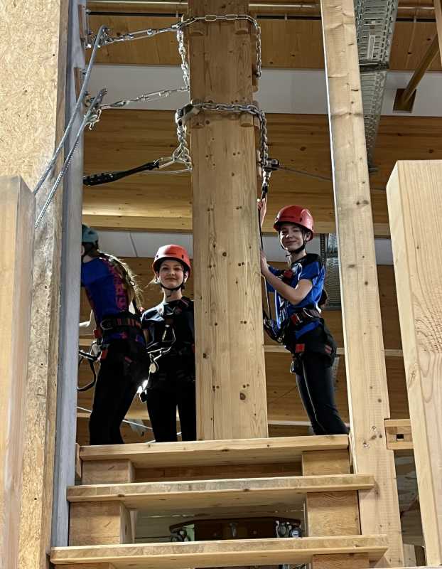 Dort angekommen, konnten diese aufgrund des geringen Schneefalls und heftigen Schauern leider nicht auf die Piste. Doch die Schüler und Schülerinnen ließen sich ihre gute Laune dadurch nicht nehmen. Also ging es weiter zur Fundorena, wo viele der Schüler und Schülerinnen die Aktivitäten Bouldern sowie Klettern im Hochseilgarten mit Freude ausüben durften. Aber auch das Haus der Natur wurde anschließend mit vielen neuen Informationen verlassen.
