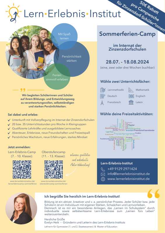 Die einen fahren in den Urlaub, die anderen kommen zum Lernen. In den ersten drei Ferienwochen ist das Lern-Erlebnis-Institut zu Gast im Internat der Zinzendorfschulen. Es wird ein Lern-Erlebnis-Camp für die Klassen 7-10 und ein Oberstufencamp für die Klassen 11-13 angeboten. Die Teilnehmenden können zwei von sechs Unterrichtsfächern und verschiedene Freizeitangebote wählen.