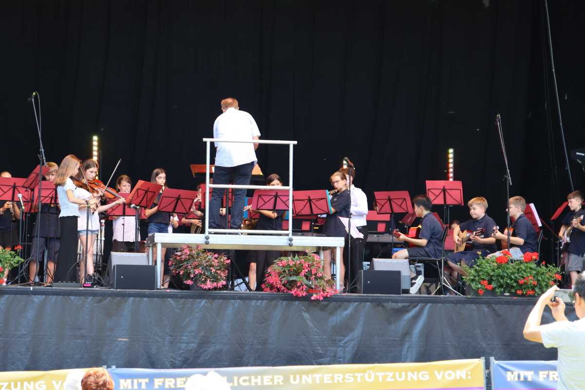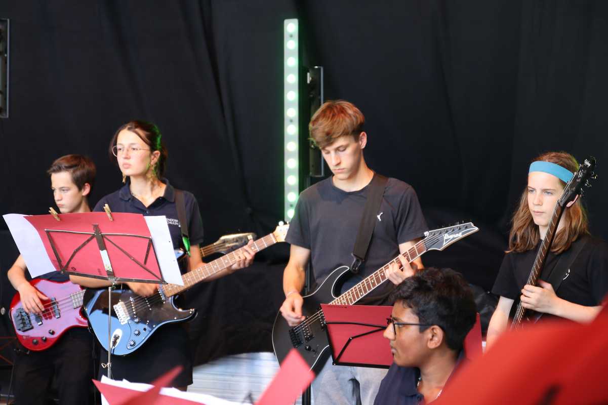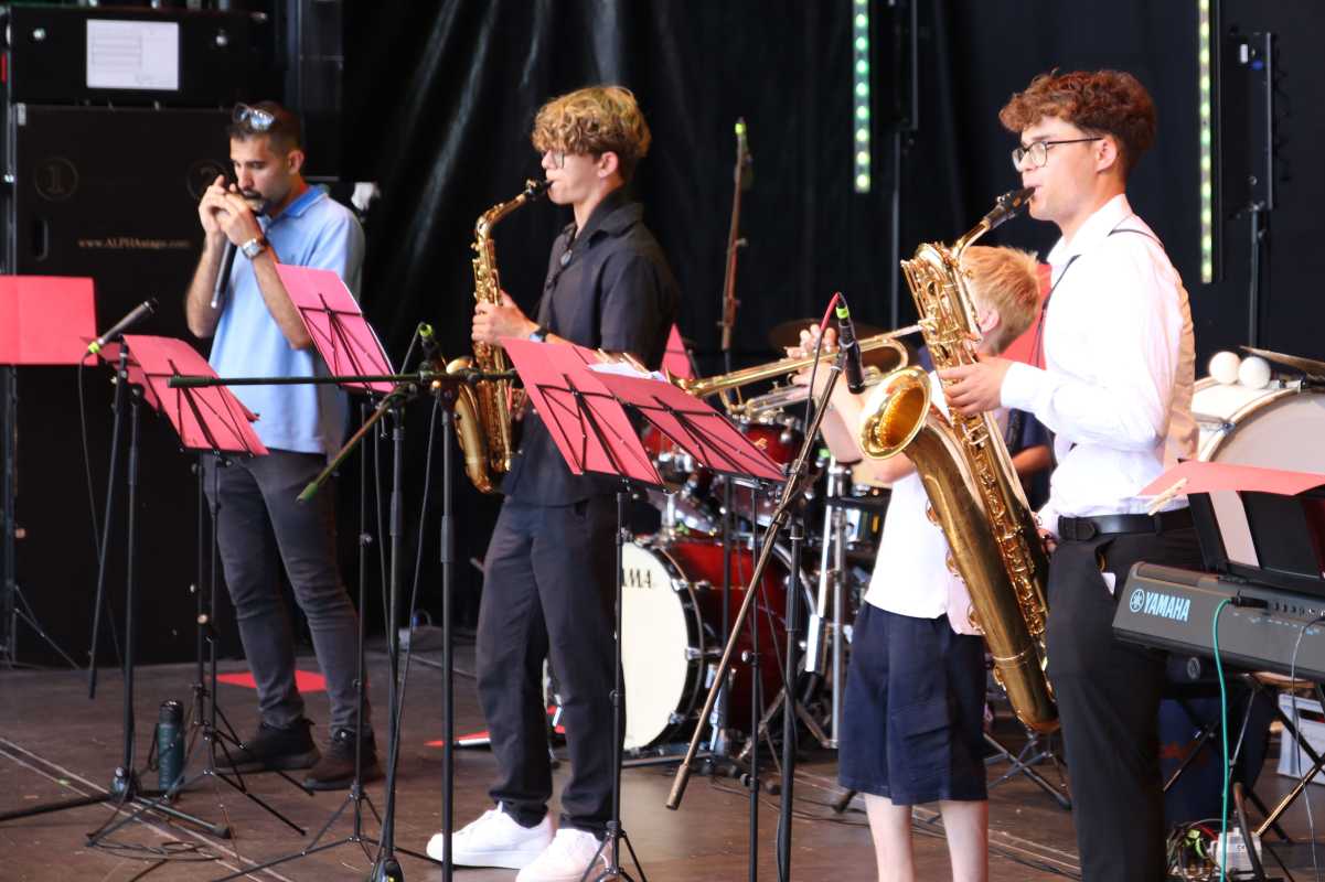 Auf der großen Open-Air-Bühne zeigten die jungen Musikerinnen und Musiker der Zinzendorfschulen eindrucksvoll ihr Können. Die Klassenorchester der Jahrgangsstufen 5 und 6, das Schulorchester, die Jazz- und Popband unter der Leitung von Benjamin Heil sowie die Zinzendorf Jazz-Combo unter der Leitung von Reinhard Ziegler nahmen das Publikum mit auf eine klangvolle Reise durch verschiedene Stilrichtungen – von barocken Meisterwerken über temperamentvolle lateinamerikanische Rhythmen bis hin zu modernen Pop- und Jazzstücken.