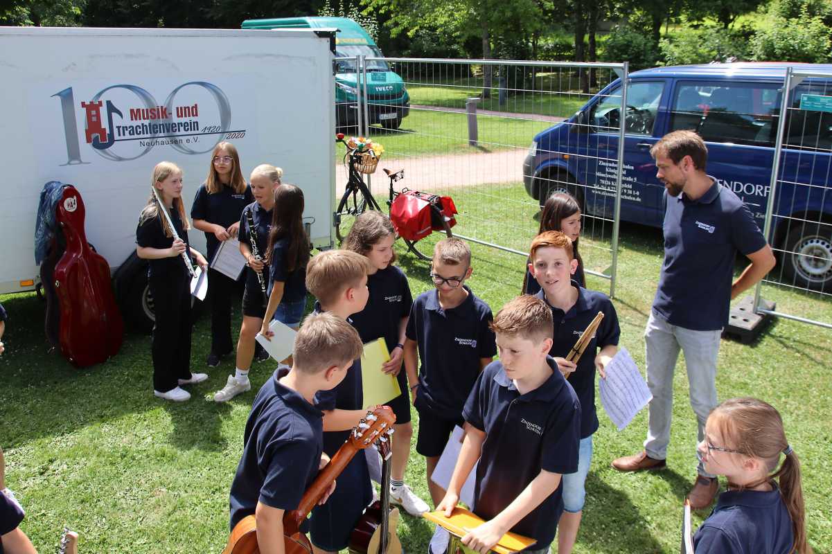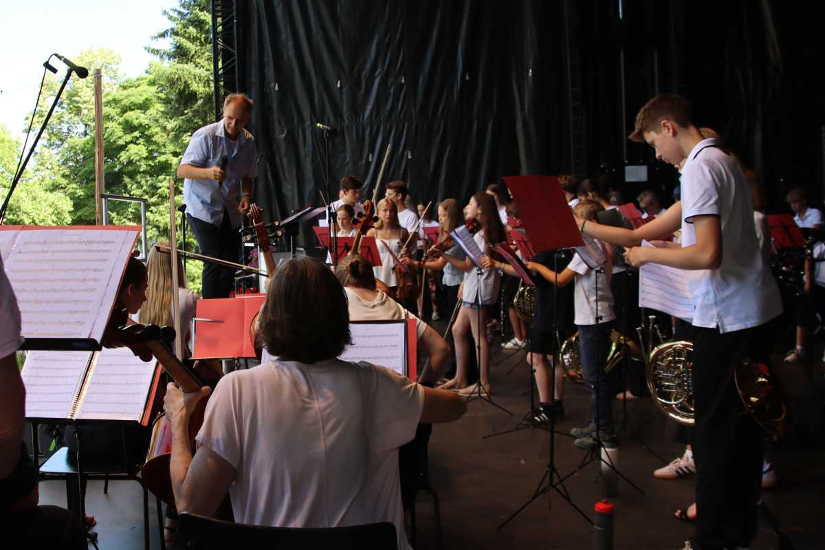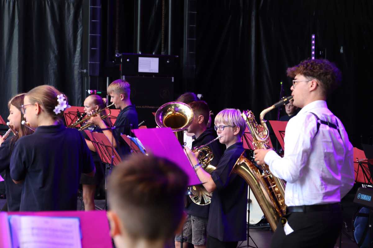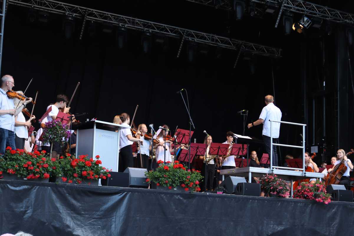 Auf der großen Open-Air-Bühne zeigten die jungen Musikerinnen und Musiker der Zinzendorfschulen eindrucksvoll ihr Können. Die Klassenorchester der Jahrgangsstufen 5 und 6, das Schulorchester, die Jazz- und Popband unter der Leitung von Benjamin Heil sowie die Zinzendorf Jazz-Combo unter der Leitung von Reinhard Ziegler nahmen das Publikum mit auf eine klangvolle Reise durch verschiedene Stilrichtungen – von barocken Meisterwerken über temperamentvolle lateinamerikanische Rhythmen bis hin zu modernen Pop- und Jazzstücken.