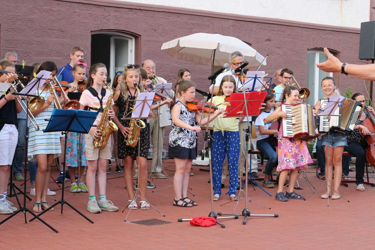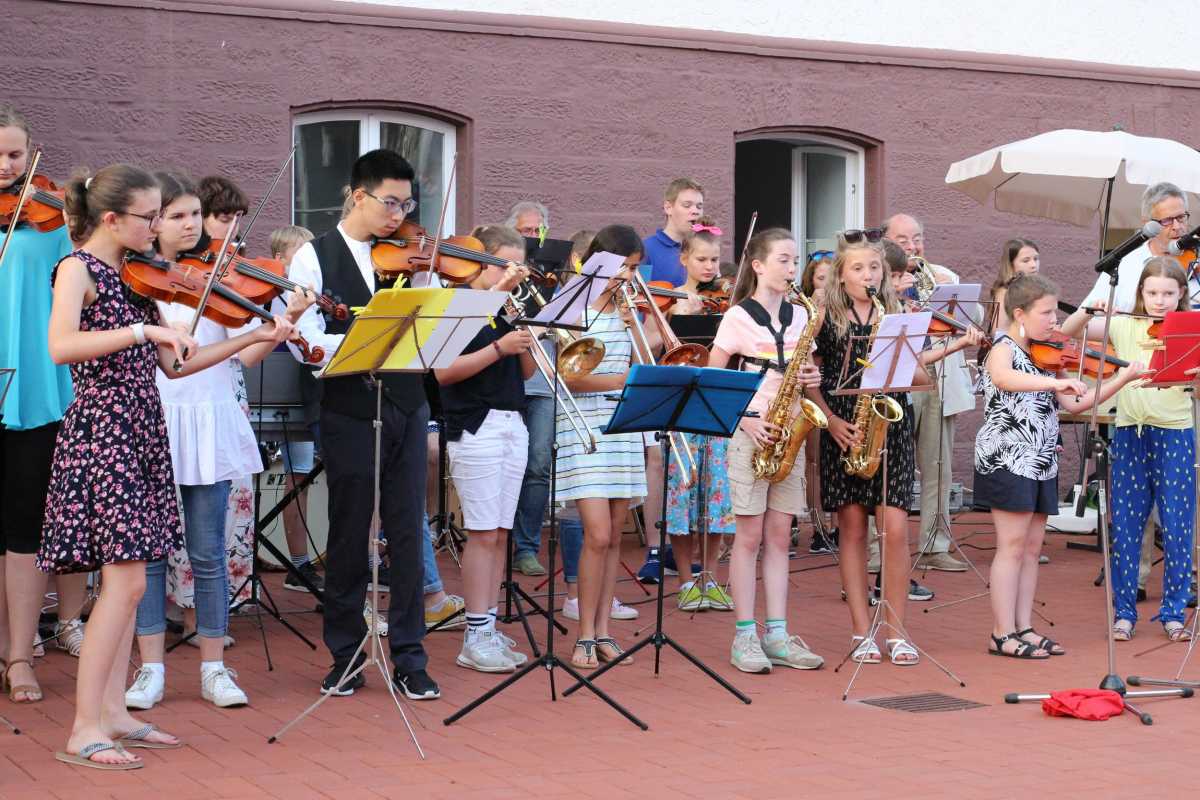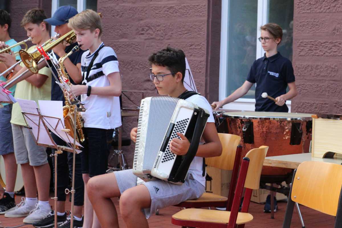 Das Schulorchester, in dem auch Lehrer, Ehemalige und Freunde des Schulwerks gemeinsam mit den Schülerinnen und Schülern musizieren, erfreute das Publikum mit Mendelssohn-Bartholdys Hochzeitsmarsch und dem irischen Steptanz-Hit „Lord of the Dance“, bevor sich die Jazzband unter anderem für „Summertime“ dazu gesellte.