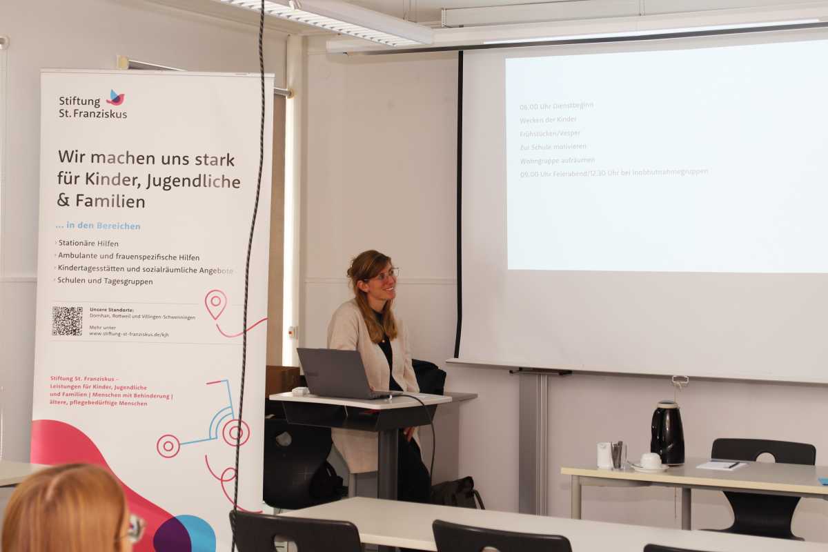 Die teilnehmenden Einrichtungen hatten Mitarbeitende aus der Praxis entsandt, die direkt aus ihrem Arbeitsalltag berichteten. Dadurch erhielten die Fachschüler*innen einen authentischen Einblick in die vielfältigen Arbeitsfelder der Sozialen Arbeit – von Kindertagesstätten über Heimerziehung bis hin zur offenen Jugendarbeit. „Vielen ist gar nicht bewusst, dass auch offene Jugendarbeit pädagogisches Arbeiten ist“, erklärte Sr. Bandholz. „Beziehungsarbeit, Beobachten, Handeln und Reflektieren – das findet dort genauso statt, nur in einem anderen Setting.“