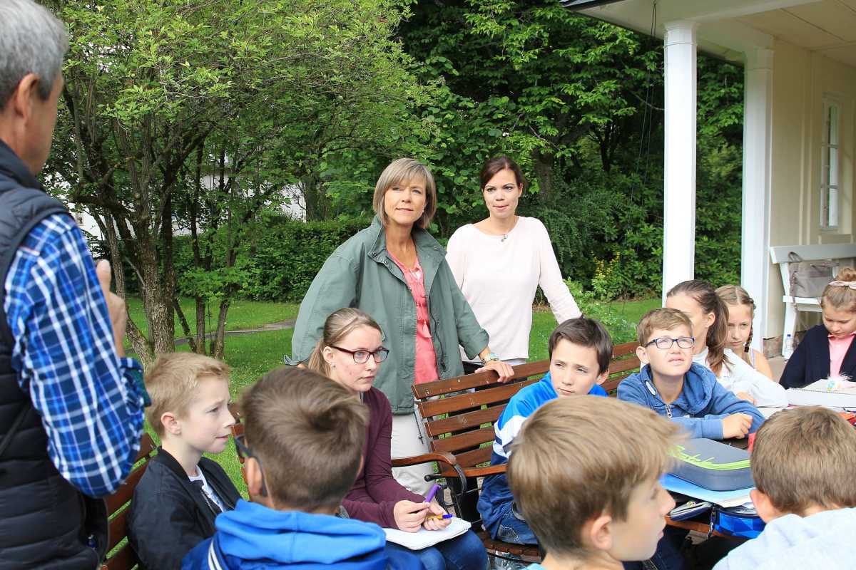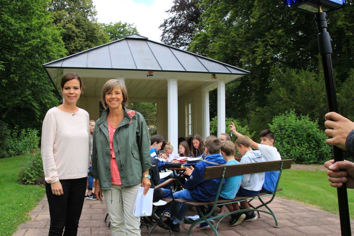 Die Sechtsklässler von Sr. Vogt durften unter freiem Himmel lernen und baten im Anschluss an ihren Auftritt die Moderatorin um Autogramme – ein Wunsch, den sie den Schülerinnen und Schülern gerne erfüllte – ebenso wie den einer Internatsschülerin nach einem Selfie.