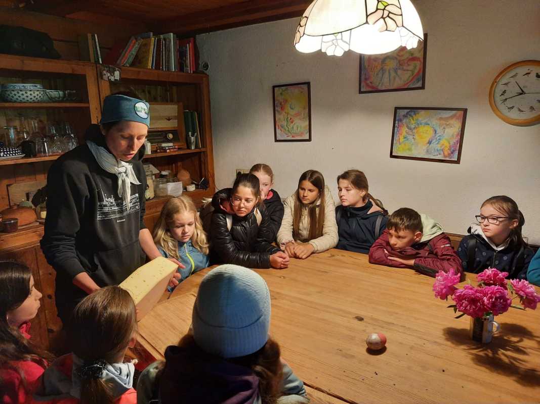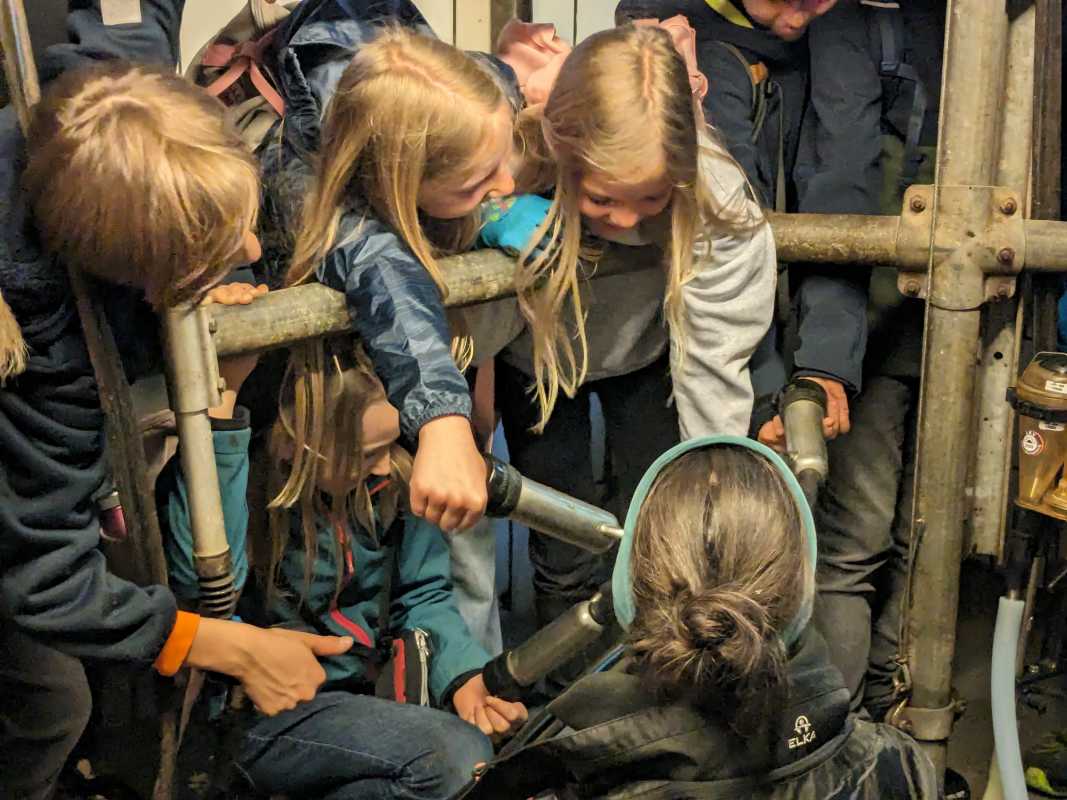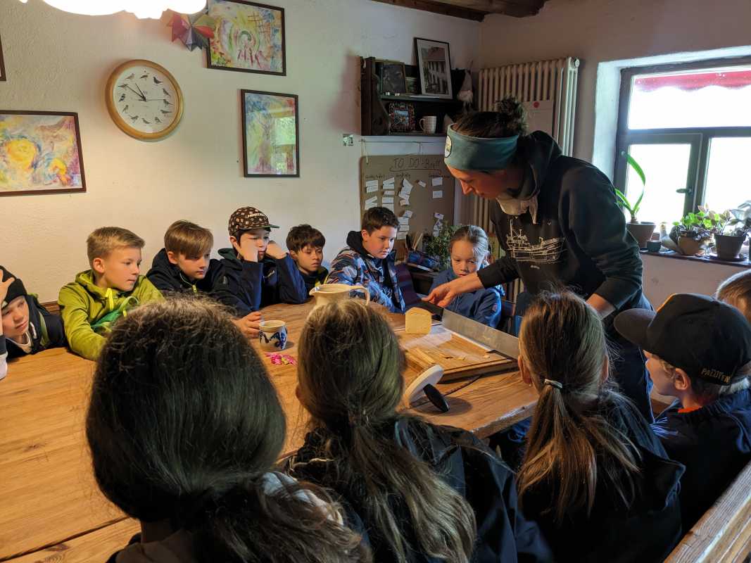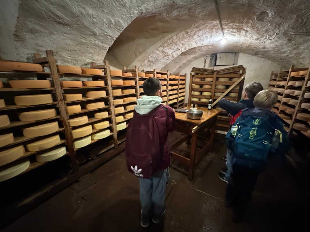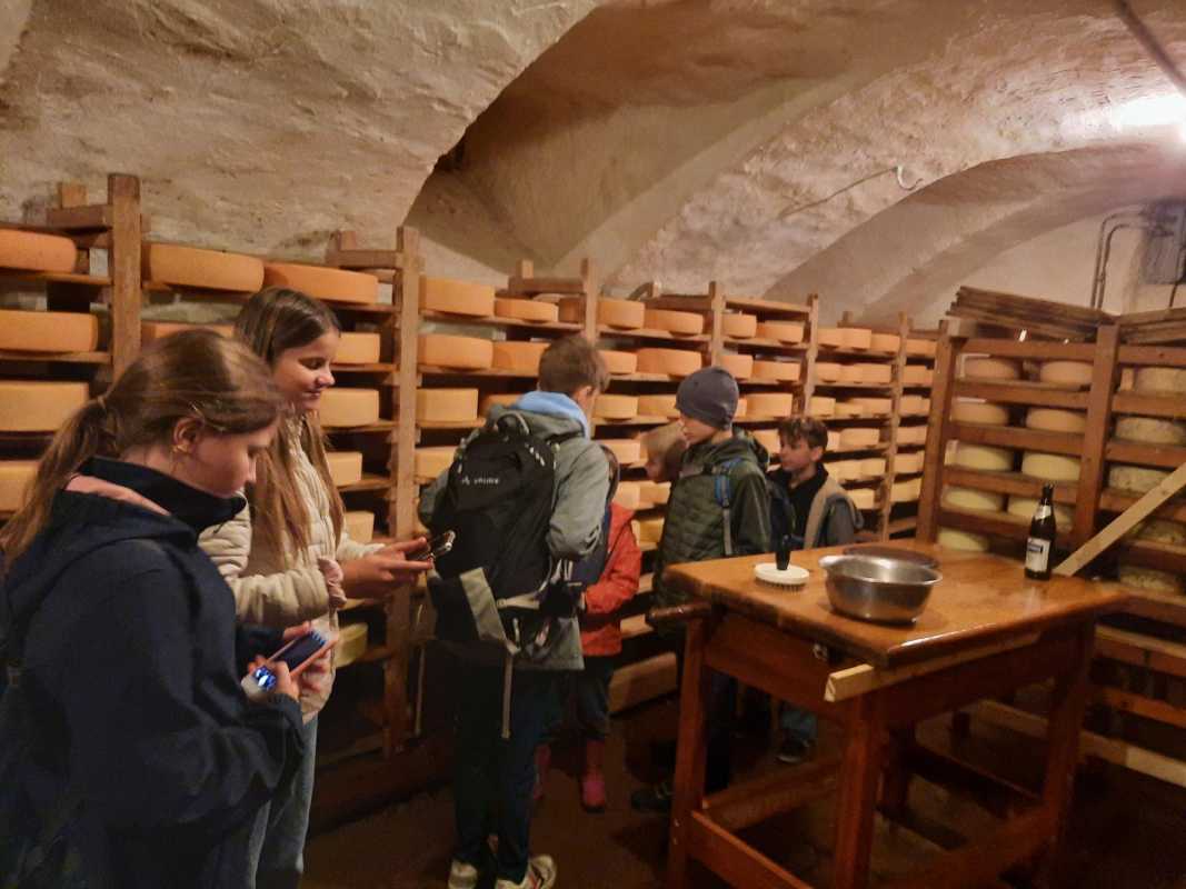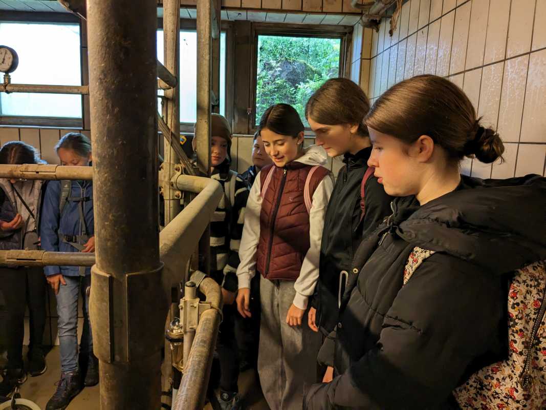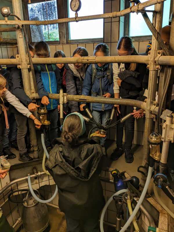 Alle drei Klassen erhielten spannende Einblicke in verschiedene Bereiche des kleinbäuerlichen Wirkens. Die Besichtigung führte sie von den Ställen über die Melkanlage bis zur hofeigenen Käserei - altehrwürdiger Käsekeller inklusive. Als Demeter zertifizierter Biohof steht auf dem Untermühlbachhof die Kreislaufwirtschaft im Vordergrund. Deshalb versuchen die Betreiber*innen des Hofes, so viel wie möglich auf dem Hof selbst zu erzeugen beziehungsweise zu nutzen und die Umwelt möglichst wenig zu belasten. Die Milch fließt so ausschließlich in hofeigene Milchprodukte, die die Schüler*innen am Ende – neben Wurstprodukten des Hofes - auch probieren durften.