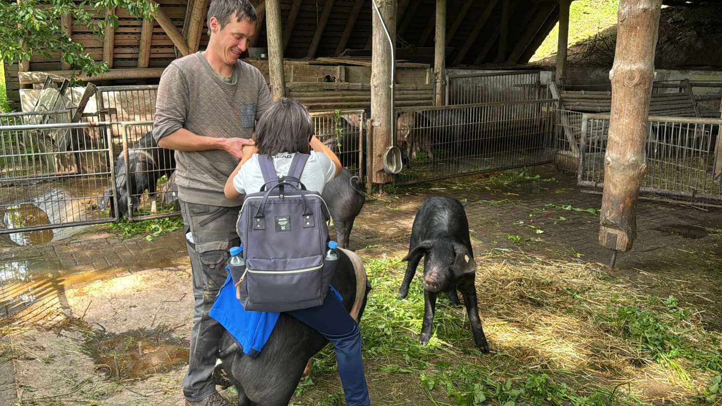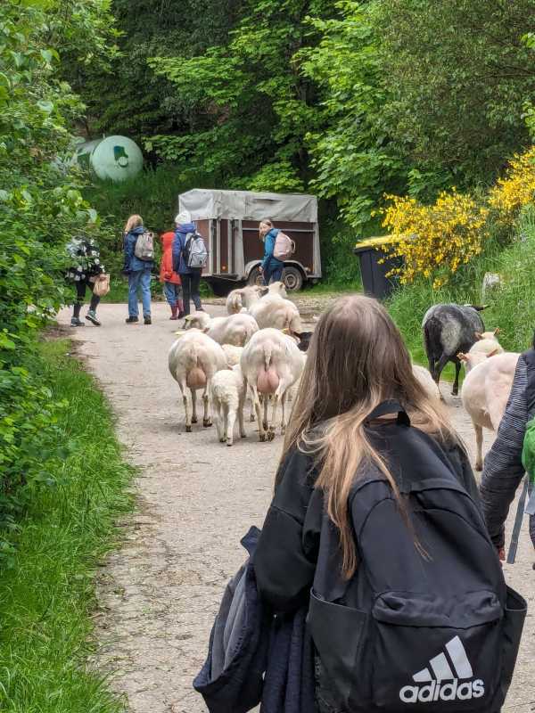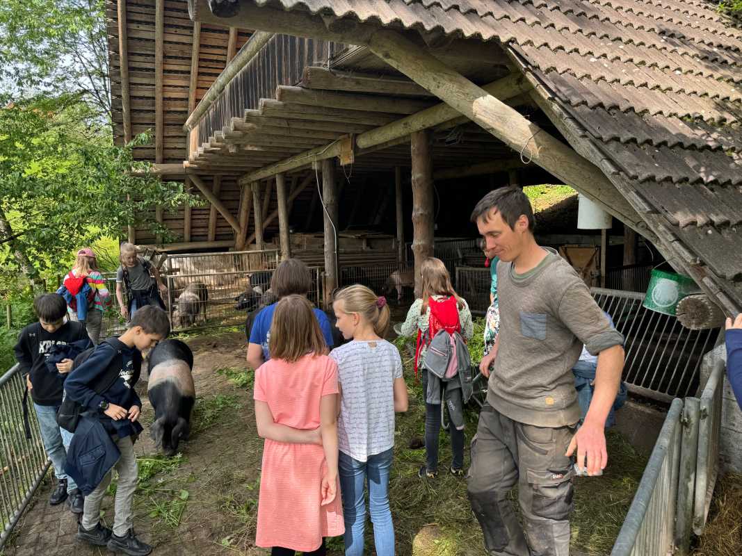 Die zwei-bis dreistündigen Führungen, die von den Mitarbeitenden des Hofes durchgeführt wurden, lösten bei den Schüler*innen viel Begeisterung aus. Dabei erfuhren sie nicht nur viel Interessantes, sondern durften sich auch aktiv in alltägliche Arbeiten auf dem Hof einbringen. So trieben die Schüler*innen Schafe und Rinder auf die Weide und fütterten die Schweine. Einige Mutige durften sogar auf ihnen reiten.