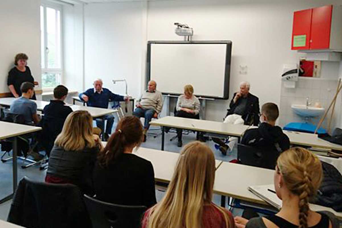 Geschichte aus erster Hand konnten zwei Geschichtskurse des Zinzendorfgymnasiums erleben, als mehrere Altschüler, die in der Zeit des Zweiten Weltkrieges in Königsfeld im Internat lebten, ihre alte Schule wieder besuchten.Sie erzählten vom Alltag ihrer Schulzeit und berichteten, wie sie als Luftwaffenhelfer eingezogen wurden – genau in dem Alter, in dem die Schüler, vor denen sie sprachen, jetzt sind. Sie schilderten Situationen, in denen sie nur durch viel Glück und Einfallsreichtum überlebt hatten. Die Gymnasiasten hörten gebannt zu und stellten viele Fragen, unter anderem nach den Erlebnissen der Ehemaligen während der Kriegsgefangenschaft, die einige Schüler mit den Erfahrungsberichten ihrer Großeltern verglichen.