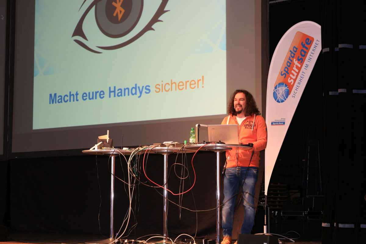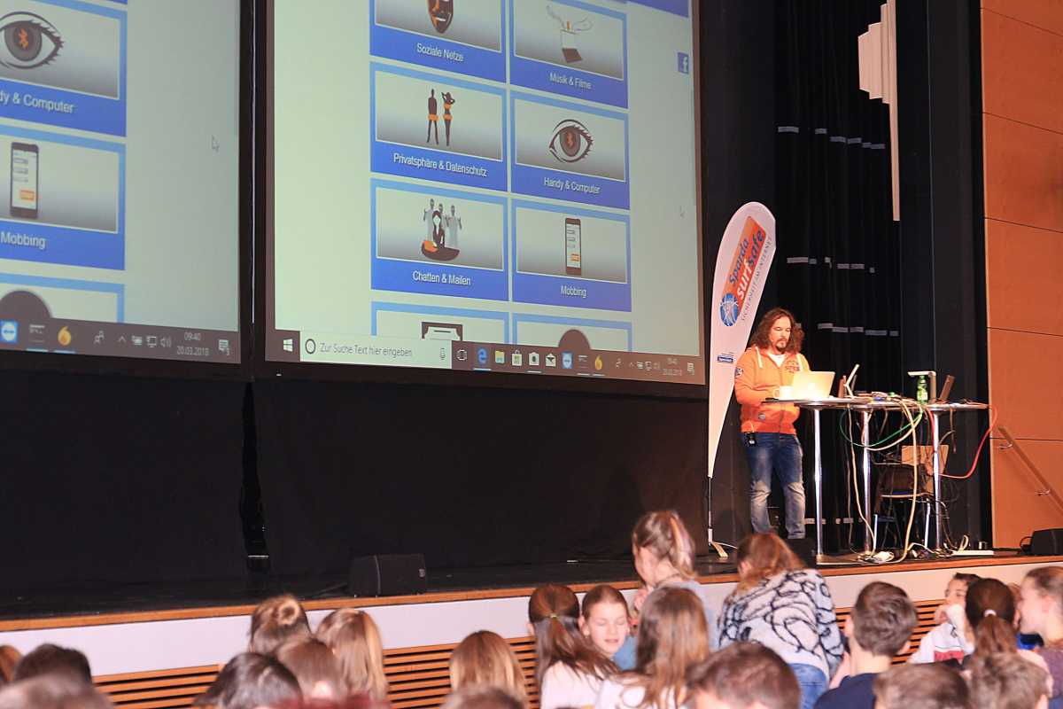 Vor den Augen der Unterstufenschüler hackte sich Markowsky sich die Handys zweier Freundinnen ein und zeigte, wie einfach es ist, unter fremden Namen eine Nachricht zu verschicken. „Handy-Nachrichten und Mails können manipuliert sein“, warnte er. „Ihr wisst nicht, wer an der Tastatur des anderen Rechners sitzt.“ Das gilt gleichermaßen für das Smartphone wie für den heimischen PC.