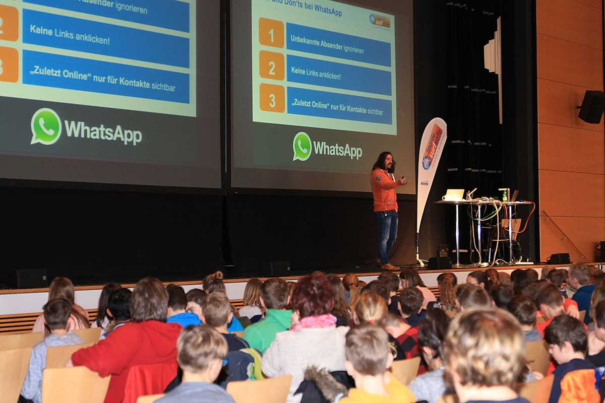 Er demonstrierte, wie einfach günstige Geräte jedem Mobiltelefon vorgaukeln können, das heimische WLan-Netz zu sein. Daher sei die WLan-Nutzung unterwegs riskant: „Woher wisst ihr, ob das WLan wirklich das von McDonald’s ist?“ Um auf Nummer sicher zu gehen, sollten die Schülerinnen und Schüler das WLan beim Verlassen des Hauses immer ausschalten, nur gezielt aktivieren und dabei auf die Zertifikate achten.