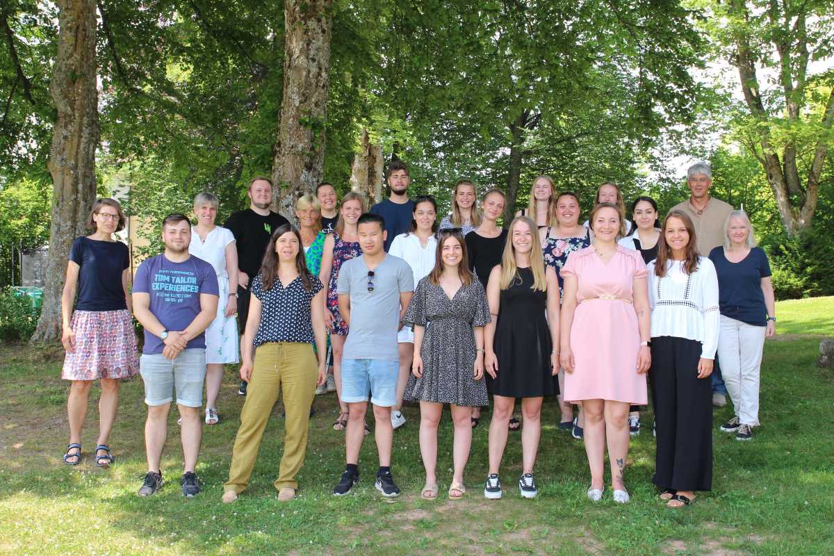 Die Fachlehrer*innen sowie die Leiterin der Abteilung Sozialpädagogik der Zinzendorfschulen, Maria-Elke Schoo-Schemmann (links) freuen sich mit Lukas Aberle, Alice Binefeld, Hivda Cangür, Noah Danisman, Tobias Disch, Wiebke Gahre, Sabrina Haberstroh, Lisa Kaluza, Juliana Koch, Joanne Körbel, Carolina Kulm, Luisa Metzger, Tobias Rogler, Julia Schütz, Franziska Schyle, Kiara Seckinger, Milena Werner.