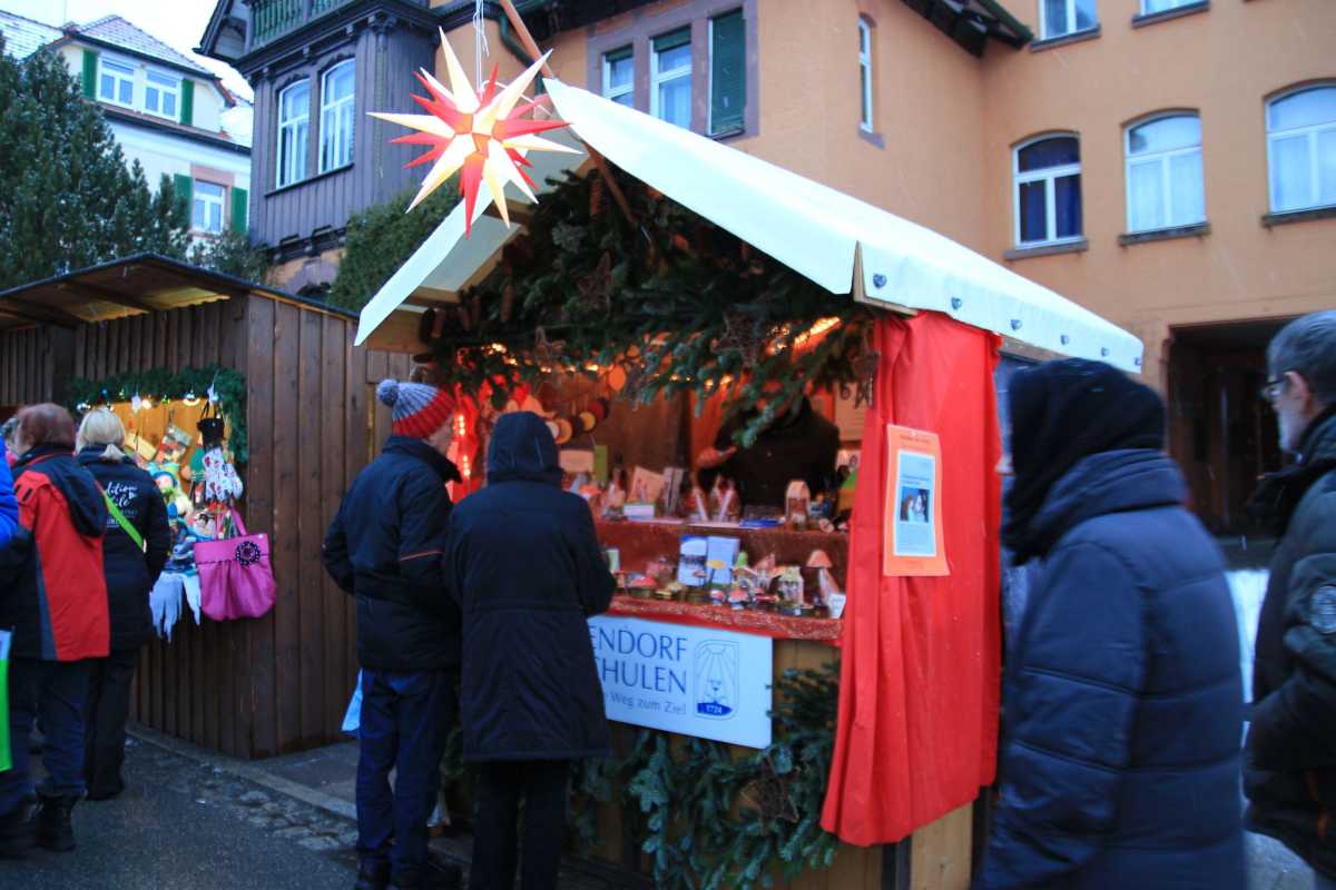 Es ist schon eine Weile her, dass sich die Zinzendorfschulen mit einem eigenen Stand am Weihnachtsmarkt beteiligt haben. Zum 25. Jubiläum eines der beliebtesten Märkte der Region waren wir wieder dabei. Die Hausmeister hatten die schöne Holzhütte, die sonst immer beim Altschülertreffen vor dem Eingang steht, in der Friedrichstraße aufgebaut. Dekoriert mit einem leuchtenden zweifarbigen Herrnhuter Stern wies sie den Besuchern im winterlichen Königsfeld schon von weitem den Weg. Und der hatte sich wahrlich gelohnt: Schülerinnen und Schüler der fünften und sechsten Klassen hatten lustige Pilze getöpfert, Sterne gebastelt und duftende Weihnachtskarten aus Gewürz-Farben gemalt.Die Berufsfachschüler hatten Lebkuchen und Plätzchen gebacken, die 70 abgepackten Plätzchen-Tüten wurden gegen eine Spende verteilt und fanden reißenden Absatz. Aber auch, als die schon längst verteilt waren, zeigten sich viele Besucher des Weihnachtsmarktes spendabel: 370 Euro landeten direkt in den Sammelbüchsen der Schülerinnen und Schüler, die sich – behängt mit Plakaten, die über den guten Zweck der Aktion informierten - unter die Besucher mischten. Diese Spenden gehen zusammen mit dem Verkaufserlös an das Förderzentrum Sternberg, das die Herrnhuter Missionshilfe nördlich von Jerusalem an der Straße von Ramallah betreibt. An einer Förderschule lernen Kinder mit Behinderungen, ihren Alltag weitgehend selbst zu bewältigen.