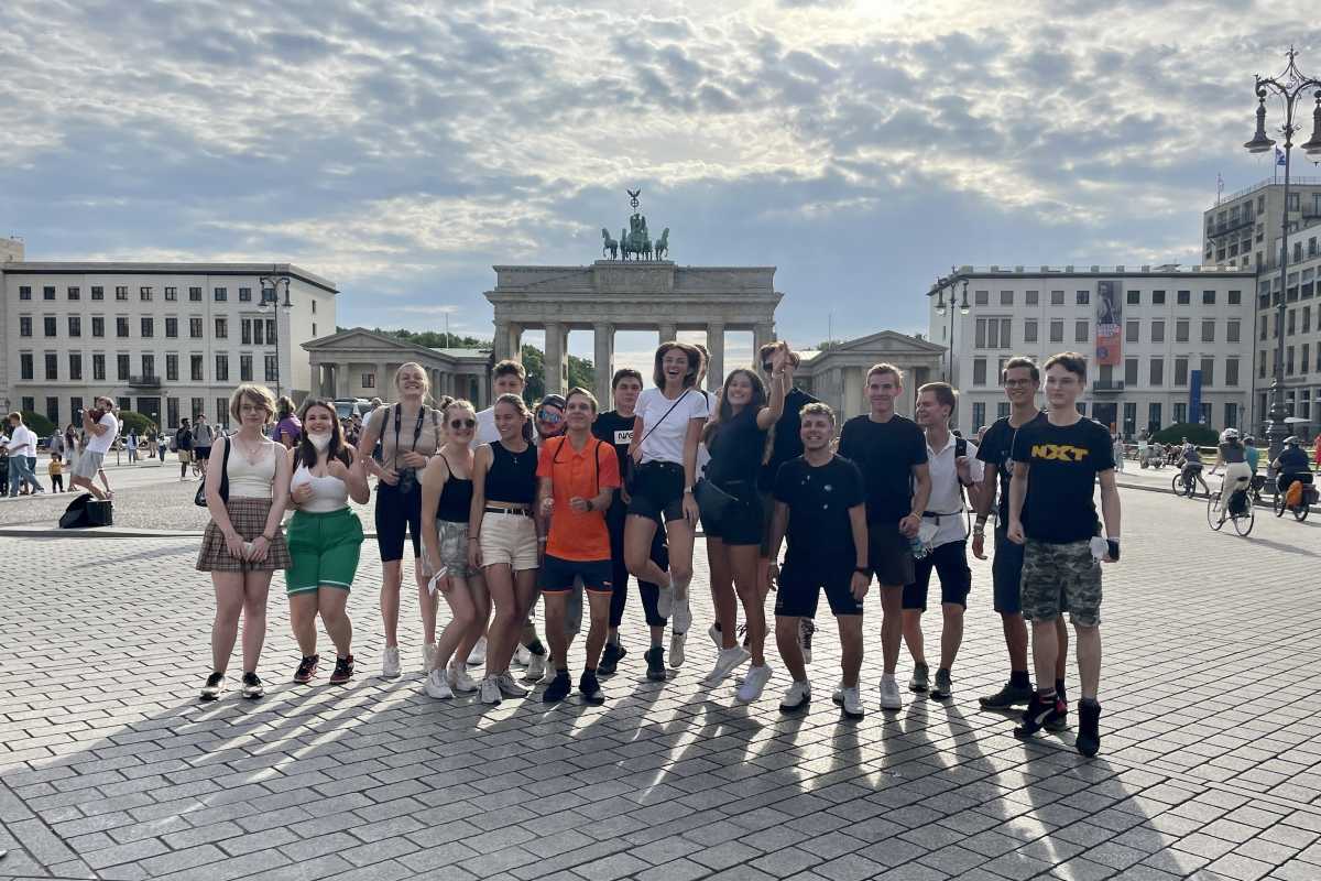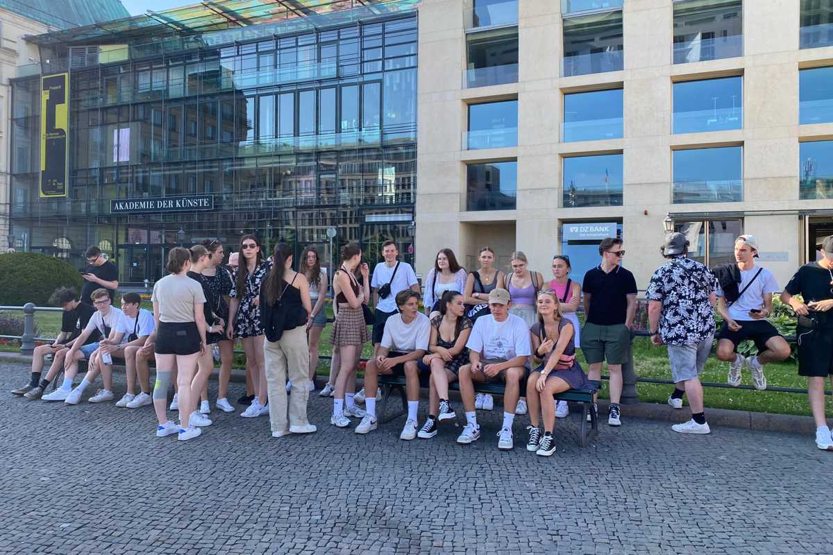 Unsere Reise begann am Montag in Villingen am Bahnhof. Aufgrund des Schienenersatzverkehres entschieden wir uns, mit dem Bus bis nach Offenburg zu fahren. Dort stiegen wir in den ICE, der dann bis Berlin durchgefahren ist. Es war eine unkomplizierte und angenehme Fahrt. In Berlin angekommen, haben wir zuerst unser Gepäck in unserem Hostel, dem Generator Hostel in der Oranienburger Straße, abgeladen und unsere Zimmer bezogen. Danach haben wir in unseren Kursen einen Spaziergang vom Brandenburger Tor zum Alexanderplatz gemacht. Den Abend konnten wir frei gestalten und waren in Kleingruppen unterwegs. Das S- und U-Bahn-Fahren war am Anfang für die meisten Schüler*innen ungewohnt, aber auch das meisterten wir nach kurzer Zeit und einigen lustigen Zwischenfällen.