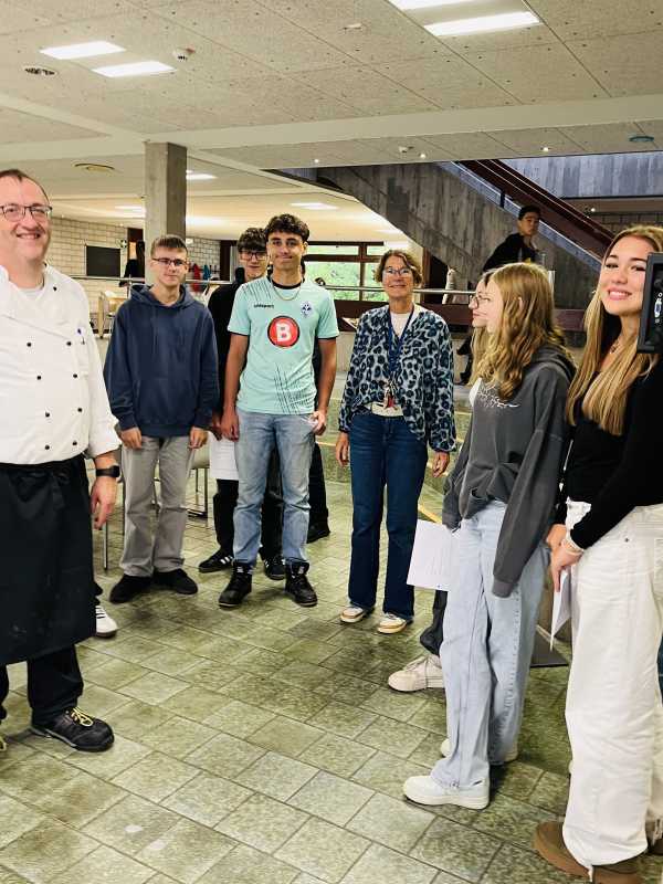Gemeinsam mit ihrer Fachlehrerin Sr. Helms besuchte die Klasse die Mensa und führte ein informatives Gespräch mit Küchenleiter Br. Steuerwald. Dieser hatte im Vorfeld vegetarische Gerichte aus dem Repertoire des Landeszentrums für Ernährung ausgewählt. Die ausgewählten Rezepte entsprechen den aktuellen Standards der Deutschen Gesellschaft für Ernährung (DGE).