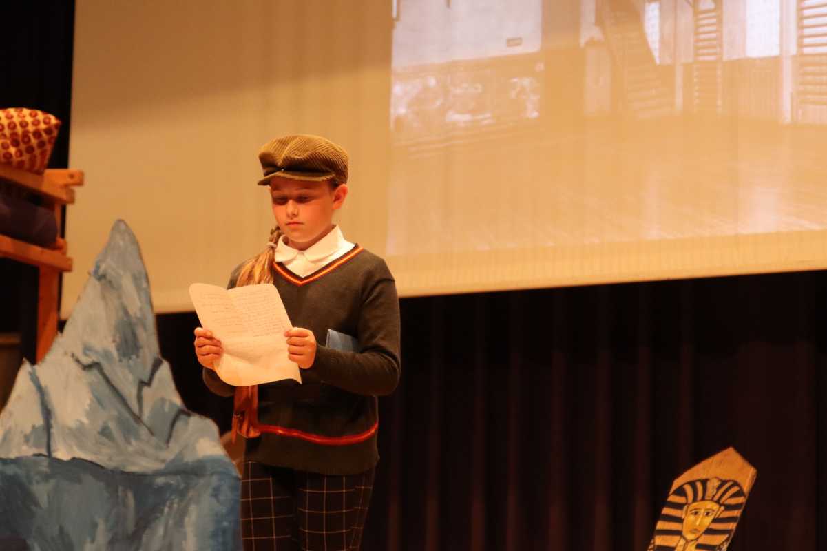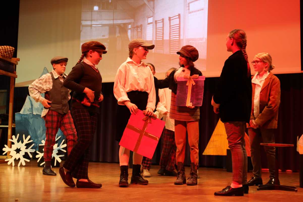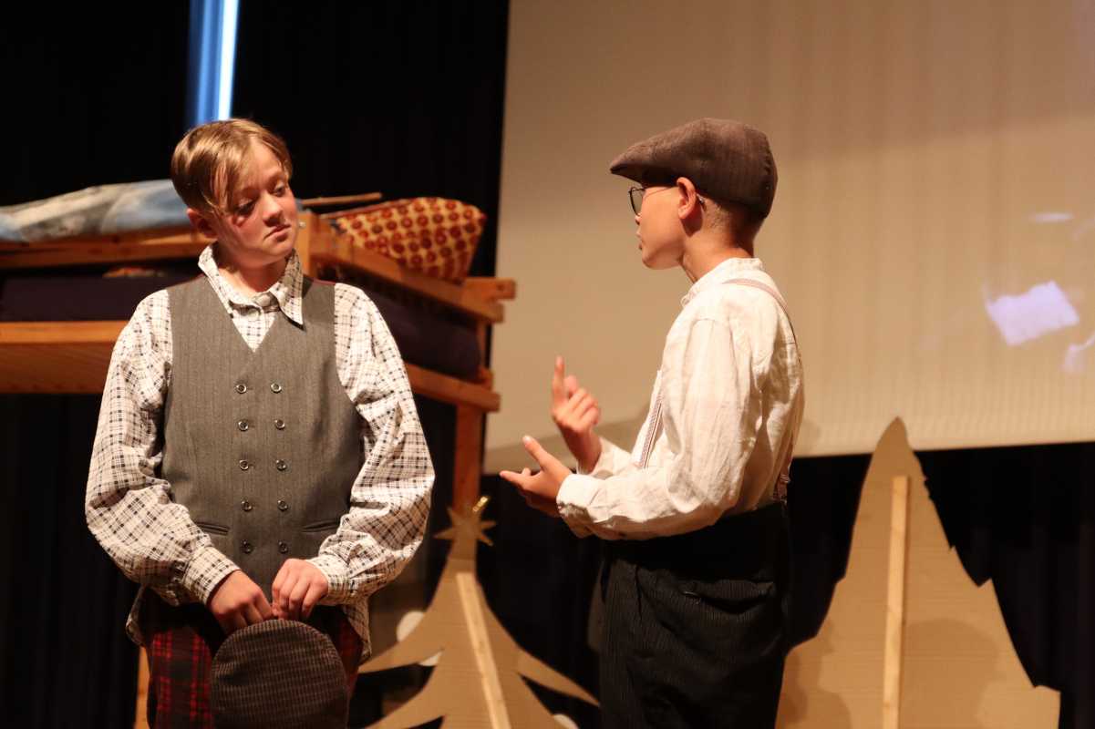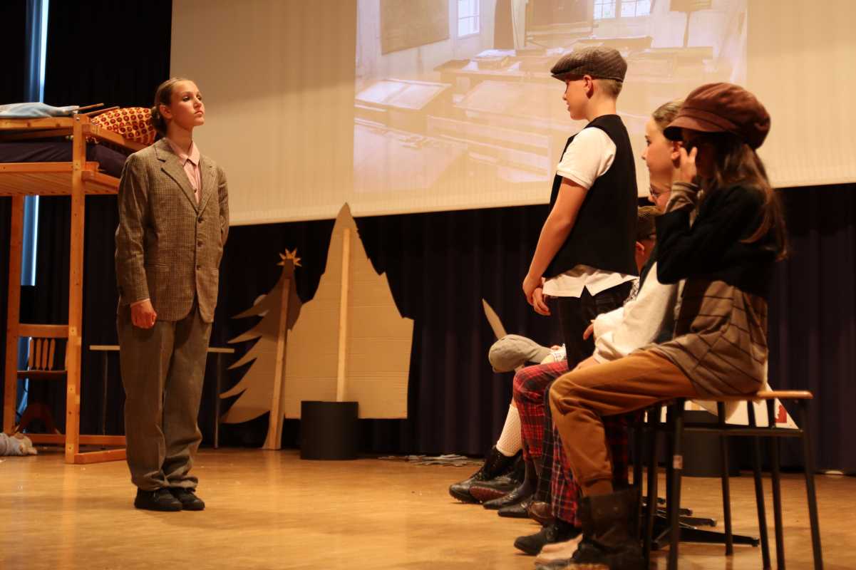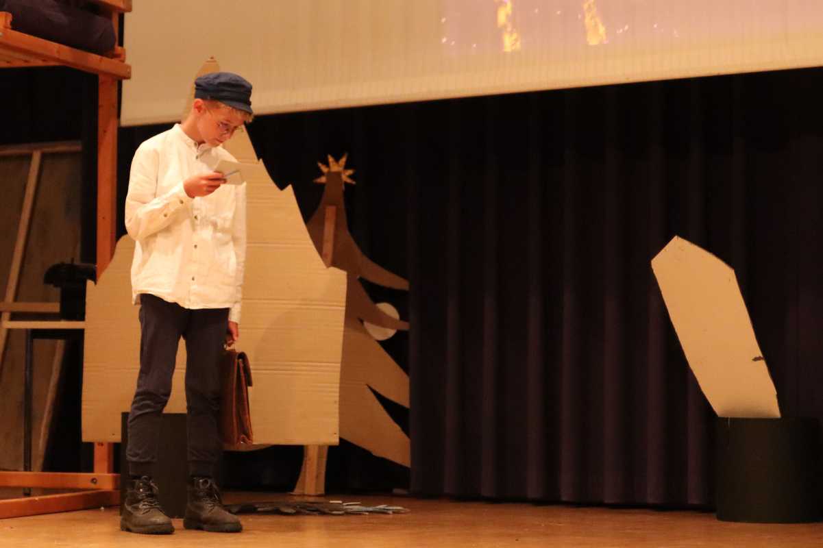 In vielen schnell und reibungslos wechselnden Szenen konnte das Publikum im Haus des Gastes miterleben, wie die Proben des Weihnachtstheaters, welches die Akteure von den Pyramiden über den Vesuv bis in den Himmel bringt, immer mehr Gestalt annahmen. Die Schüler brachten ihren beliebten Hauslehrer Justus Bökh (Philippa Koch) mit seinem alten, aus den Augen verlorenen Schulfreund, dem „Nichtraucher“, zusammen, alle packen aufgeregt ihre Koffer für die Weihnachtsferien und die Heimfahrt von Martin (Jule Schmidt), der sich die Zugfahrt nicht leisten kann, wird doch noch gerettet.