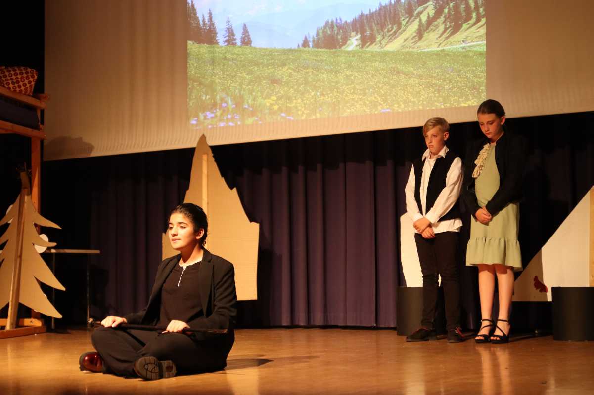 Das junge Ensemble hatte für einen gelungenen Theaterabend gesorgt, das Bühnenbild der Kunstlehrerin Sr. Saurer bot den perfekten Rahmen für jede einzelne der zahlreichen Szenen. Zwei Schülerinnen aus dem Literatur- und Theaterkurs der Oberstufe hatten die Maske übernommen und der routinierte Berufsfachschüler Leopold Blum – wie schon bei vielen Gelegenheiten - die Technik.