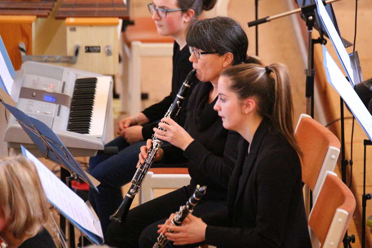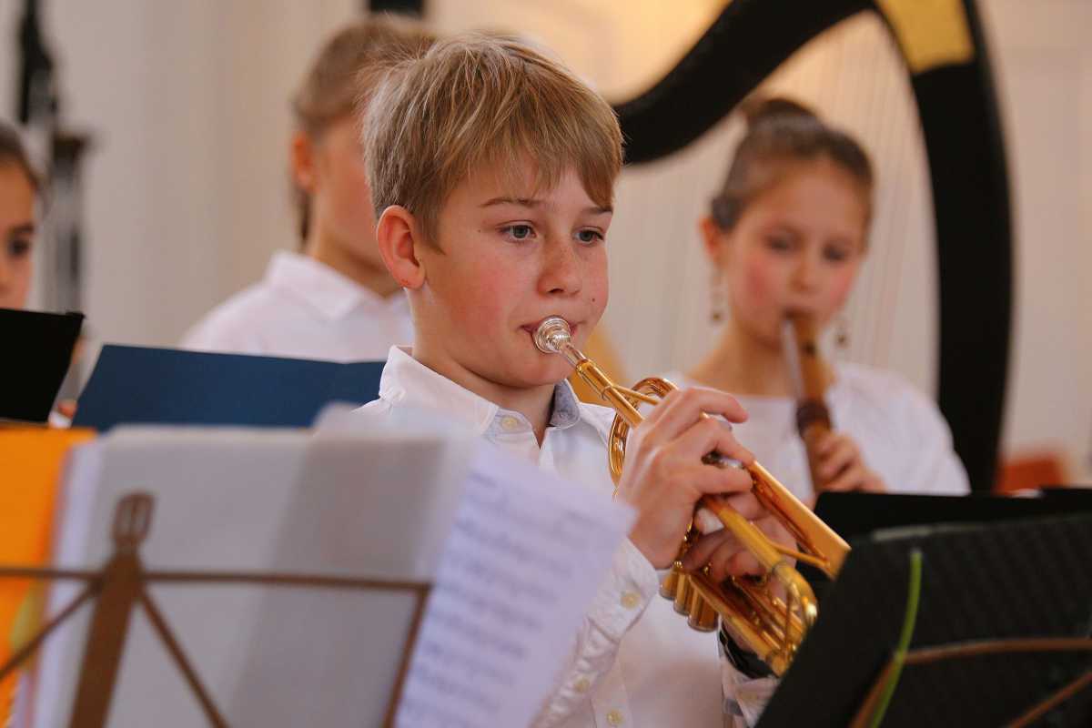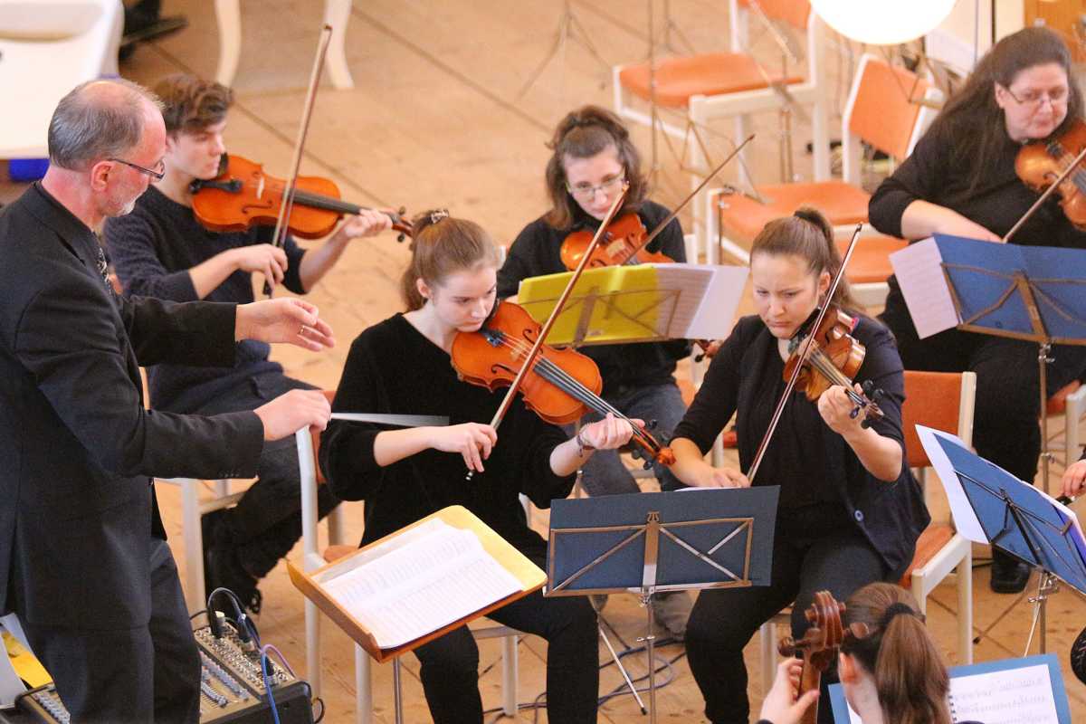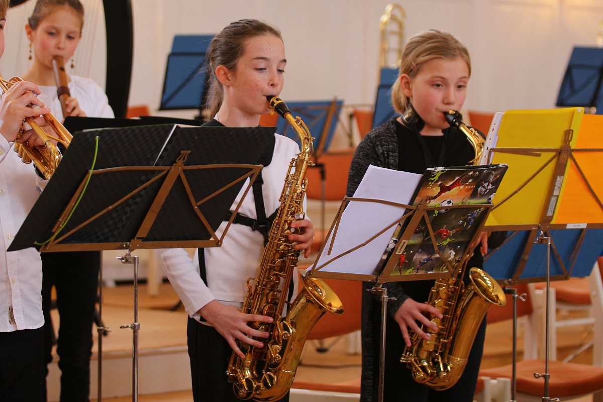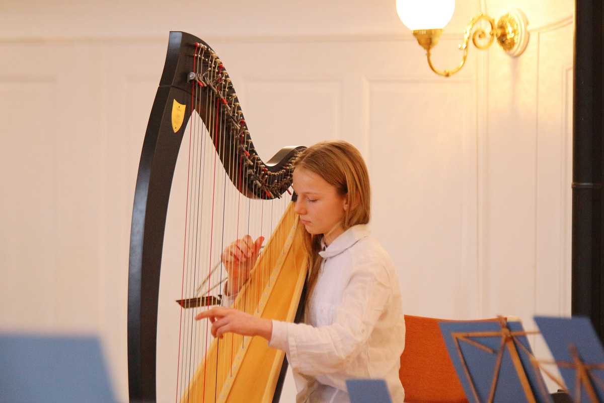 Zuvor hatten zwei Solisten, deren Melodien Jahrhunderte auseinanderliegen, die Bühne jeweils ganz für sich: Die Sechstklässlerin Josefa Efinger spielte auf der Harfe das traditionelle irische Stück „Brian Boru‘s March“, der Abiturient Samuel Sembach interpretierte auf dem Flügel ein modernes, selbstkomponiertes Stück und bei der gemeinsamen Zugabe aller Beteiligter, dem kubanischen „Guantanamera“ legten die jüngsten Musiker unter anderem als überzeugende Rhythmus-Sektion besonders ins Zeug.