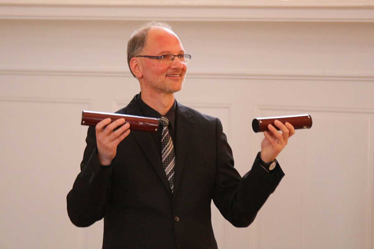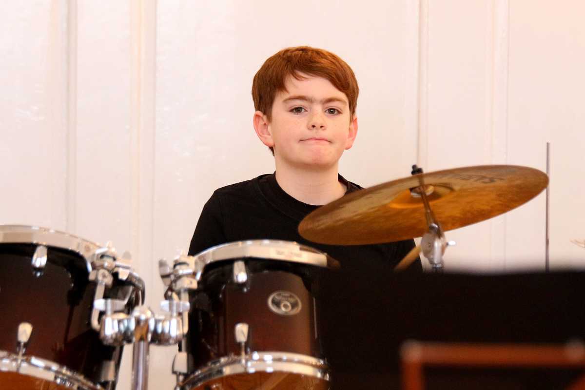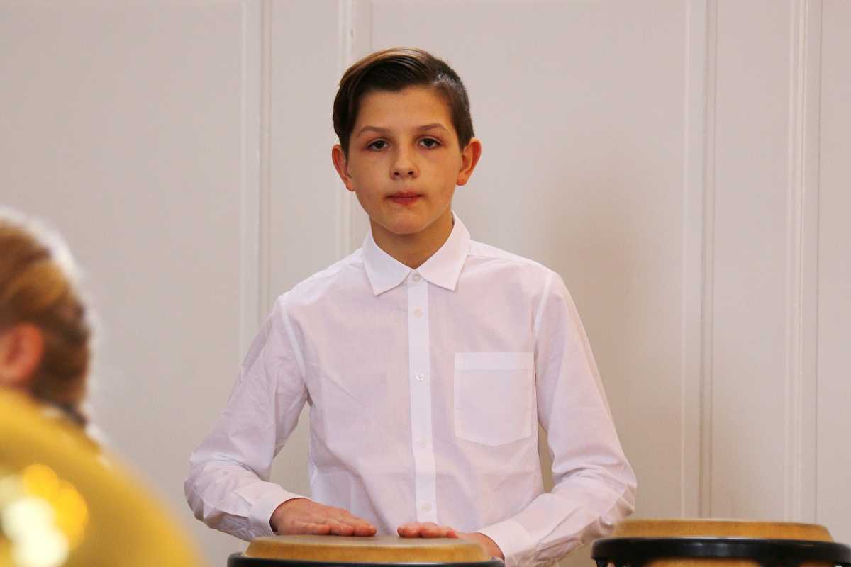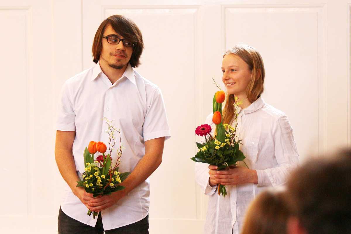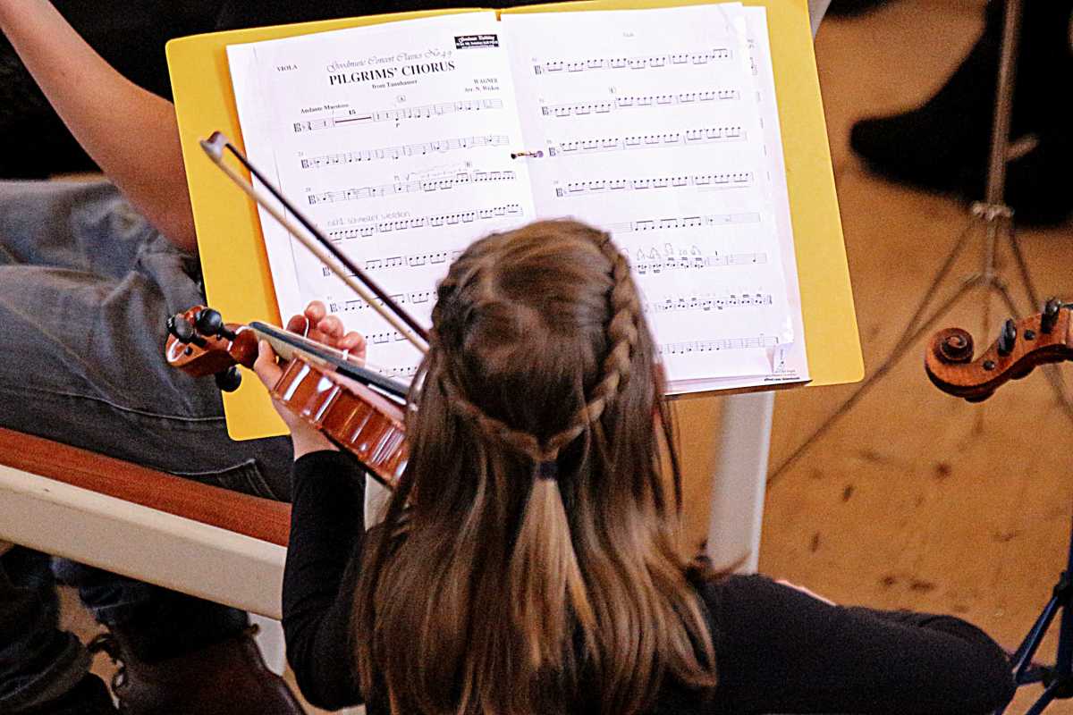 Zuvor hatten zwei Solisten, deren Melodien Jahrhunderte auseinanderliegen, die Bühne jeweils ganz für sich: Die Sechstklässlerin Josefa Efinger spielte auf der Harfe das traditionelle irische Stück „Brian Boru‘s March“, der Abiturient Samuel Sembach interpretierte auf dem Flügel ein modernes, selbstkomponiertes Stück und bei der gemeinsamen Zugabe aller Beteiligter, dem kubanischen „Guantanamera“ legten die jüngsten Musiker unter anderem als überzeugende Rhythmus-Sektion besonders ins Zeug.