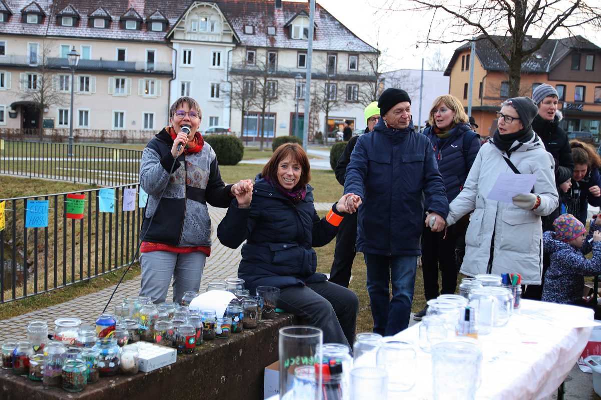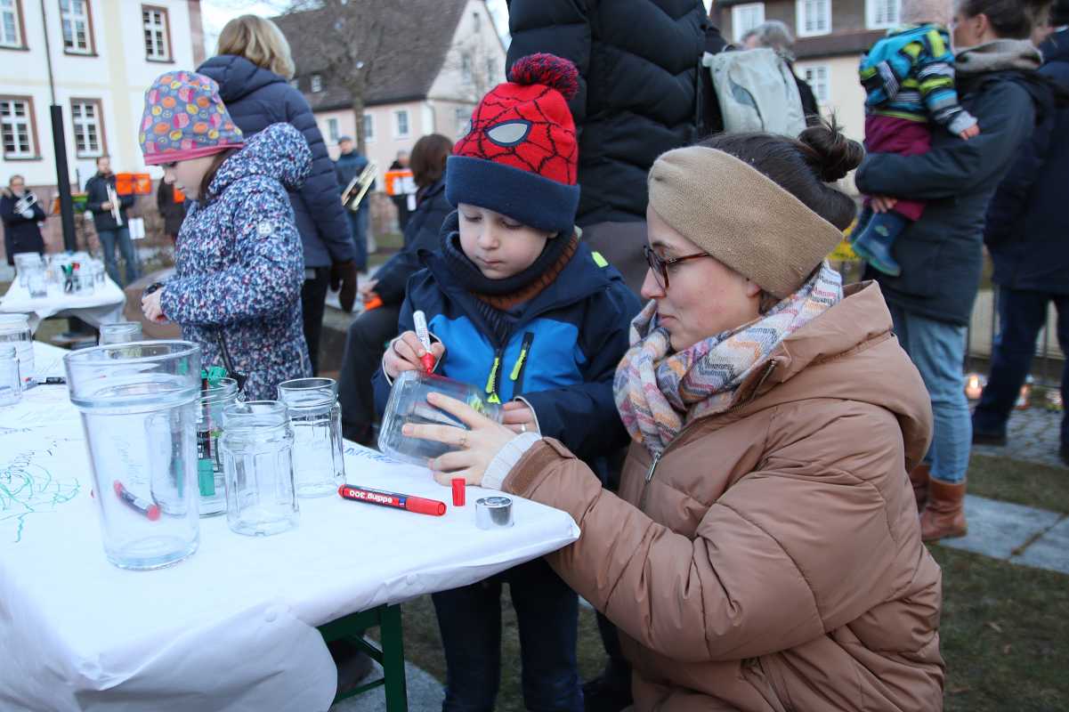 Zur Auftaktkundgebung der gut zwei Wochen dauernden Aktion, die musikalisch von einer Bläsergruppe begleitet wurde, waren auch viele Familien mit Kindern gekommen. „Ich finde es wichtig, für Menschlichkeit zusammenzustehen und Kindern zu vermitteln, wie wichtig es ist, dass es auf der Welt friedlich zugeht“, sagte Carolin Willi, deren Sohn Jonathan unter anderem ein Glas mit der Botschaft „Liebe statt Hass“ gestaltet hat. Der Fünfjährige hatte sich selbst für diese Gestaltung entschieden.
