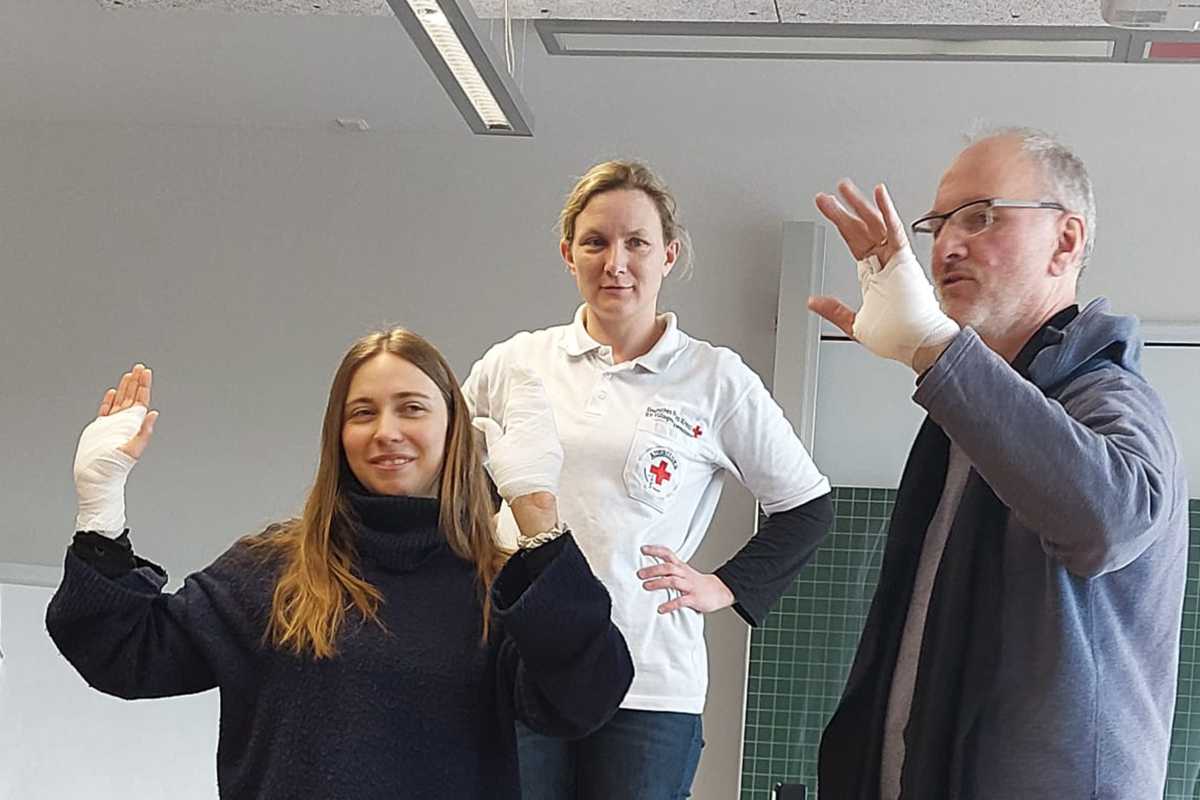 Wer schon ein paar Jahre seinen Führerschein hat, kennt das Problem: Der Erste-Hilfe-Kurs liegt lange zurück und die große Unsicherheit macht sich breit: Welcher Arm wird bei der Stabilen Seitenlage noch mal angewinkelt? Welche Art von Wunden werden wie versorgt und wie wird eine Unfallstelle abgesichert? Das Deutsche Rote Kreuz hatte am ersten Ferientag eine Basisschulung angeboten, an der 57 Mitarbeitende aus allen Bereichen von Schule, Internat und Verwaltung teilnahmen.