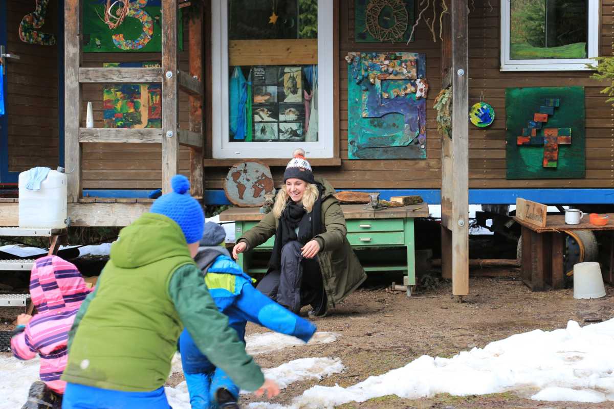 Der Tagesablauf im Waldkindergarten gefällt ihr sehr gut. „Ich bin selbst gerne in der Natur und die Aufgaben hier sind sehr vielseitig.“ Morgens, wenn die ersten Kinder von ihren Eltern gebracht werden, spielt sie mit ihnen, bis alle der derzeit 17 Jungen und Mädchen da sind. Gemeinsam mit dem Erzieherteam geht es dann zum Morgenkreis im Tipi, wo die Kinder beispielsweise erste Zahlen lernen. Bei so gut wie jedem Wetter sind sie draußen, basteln mit Materialien, die sie im Wald finden, führen Experimente durch, klettern und spielen. Später am Vormittag bereiten alle gemeinsam ihr Vesper zu, da gibt es zum Beispiel mal eine Suppe oder vegetarische Würstchen, die über dem Lagerfeuer im Tipi gegrillt werden.