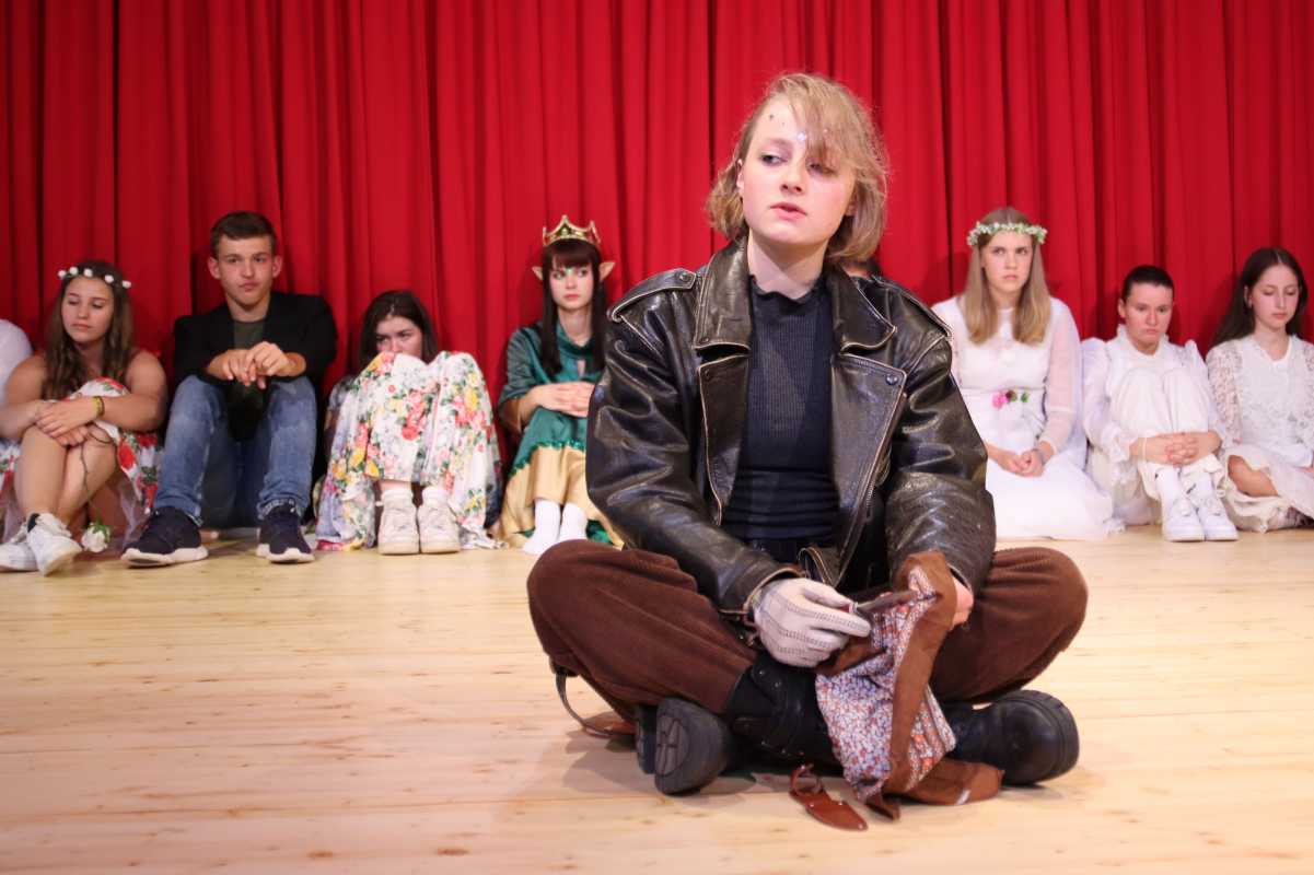 Dabei ging es vor allem darum, unterschiedlichste Rollen zu entwickeln und ihnen ein Profil zu geben – sei es im Monolog, in der Interaktion mit anderen Figuren oder auch im chorischen Element. Die Oberstufenschülerinnen und -schüler hatten dafür Fragmente aus Shakespeares Sommernachtstraum und Arthur Millers Hexenjagd bearbeitet, neu interpretiert und zum Teil auch umgeschrieben. „Alles vom Text über die Kostüme bis zu den Requisiten sind eigene Ideen und Entscheidungen der Schülerinnen und Schüler“, erklärte Br. Hudek, der den Kurs leitet. Ihm fällt auch die sicher nicht leichte Aufgabe zu, die Leistungen der einzelnen Darsteller zu bewerten.