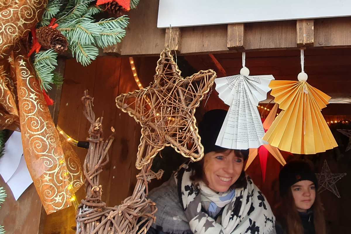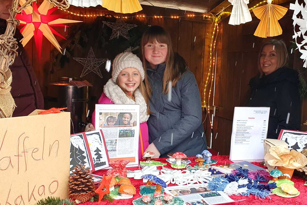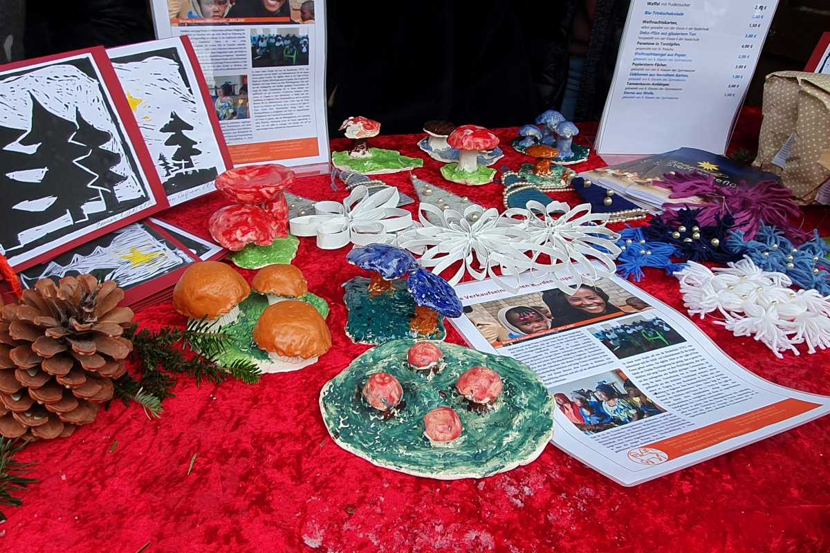 Tagelang haben Schüler*innen verschiedener Klassen und Schularten Fenster- und Baumschmuck gebastelt, Weihnachtskarten mit Linolschnitt hergestellt und bunte Pilze aus Ton geformt. Am Samstag wurden diese Waren auf dem Königsfelder Weihnachtsmarkt angeboten. Viele Schülerinnen und Schüler – vor allem aus der 6Ra – und ihre Eltern hatten Standdienste übernommen.