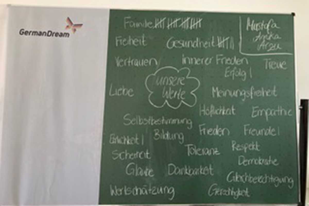Zu Beginn des 90-minütigen Wertedialogs sammelte Mustafa Al Ammar die Werte, die den Schülerinnen und Schülern besonders wichtig sind, dabei wurden Familie und Gesundheit am häufigsten genannt, aber auch Werte wie Meinungsfreiheit, Empathie, Demokratie, Erfolg und vieles mehr wurden thematisiert.