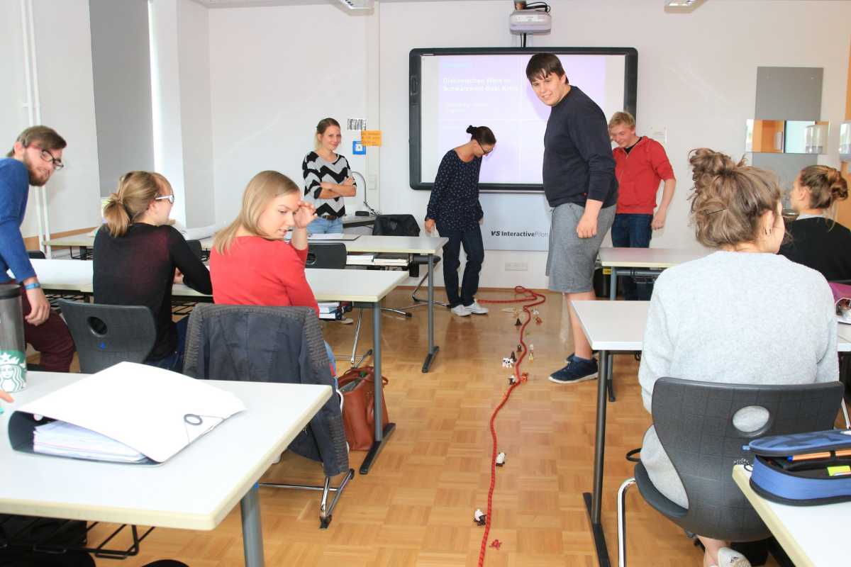 „Die Methodik spielt bei der Beratung eine wichtige Rolle“, erklärten sie und verbanden ihre erste Frage an die Schülerinnen und Schüler im Profilfach Pädagogik und Psychologie gleich mit einem Beispiel. Jeder suchte sich ein Spielzeugtier aus und setzte es an die Stelle eines Seils, das von „Ich habe keine Ahnung von der Arbeit an Beratungsstellen“ bis zu „Ich kenne mich sehr gut aus mit der Arbeit von Beratungsstellen“ geht. Im Laufe der Doppelstunde wanderte die gemischte Herde von einem Ende des Seils zum anderen.
