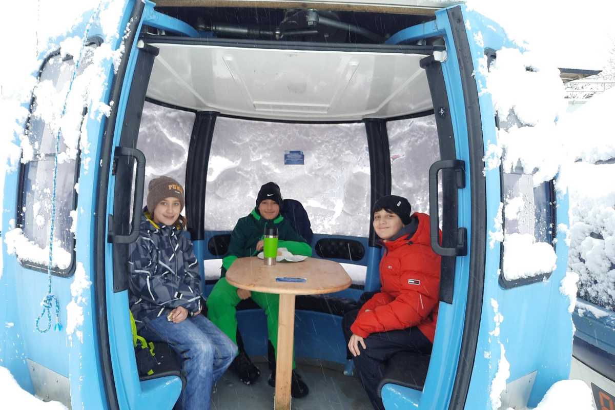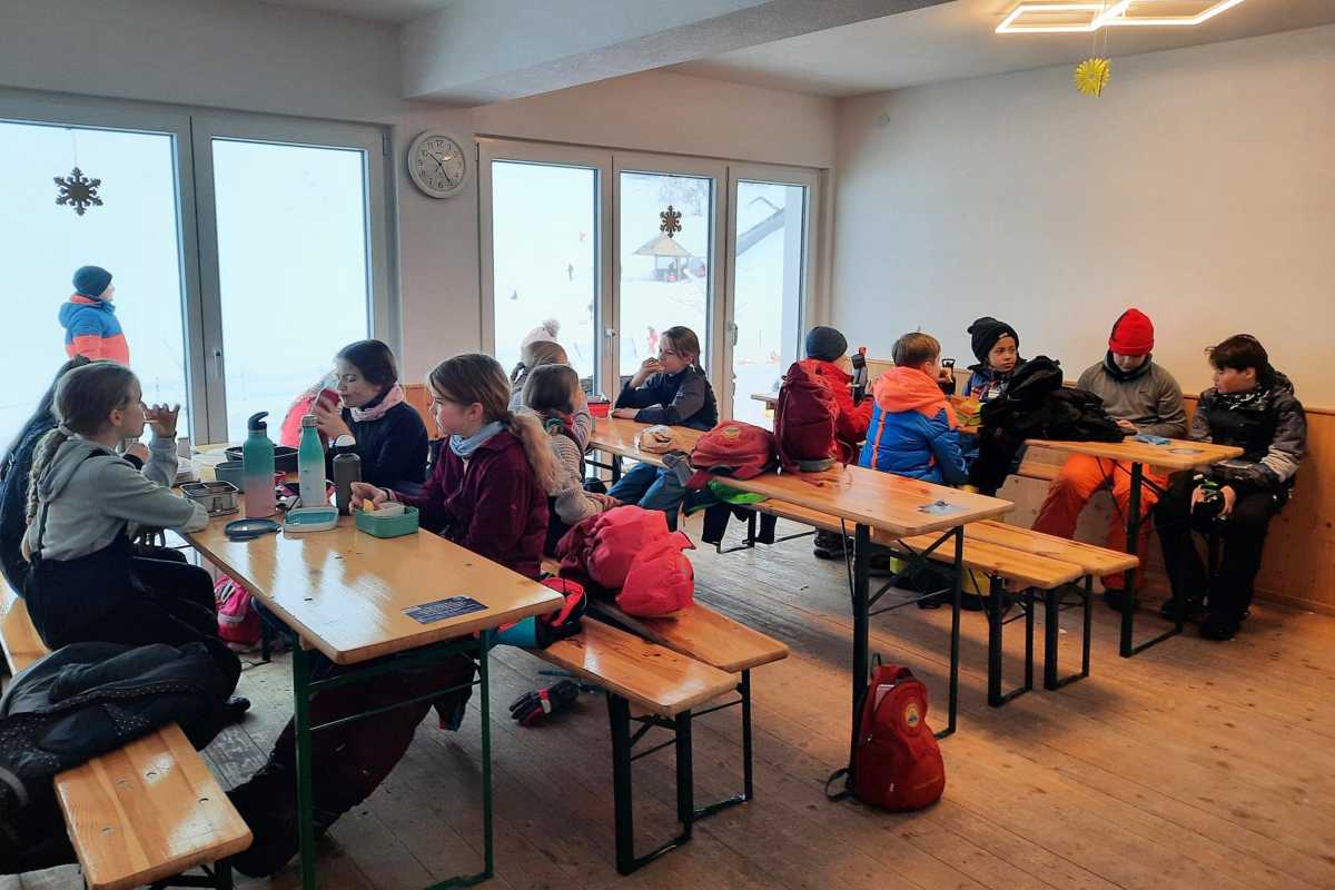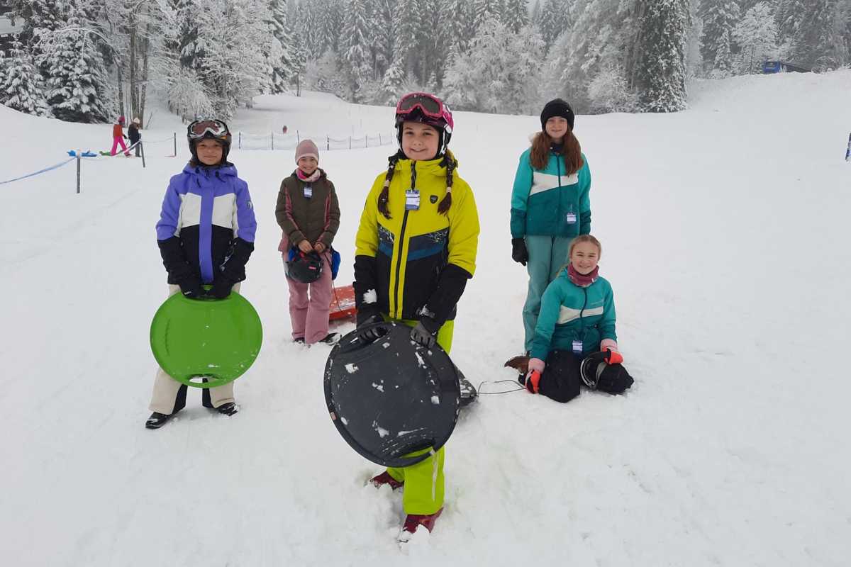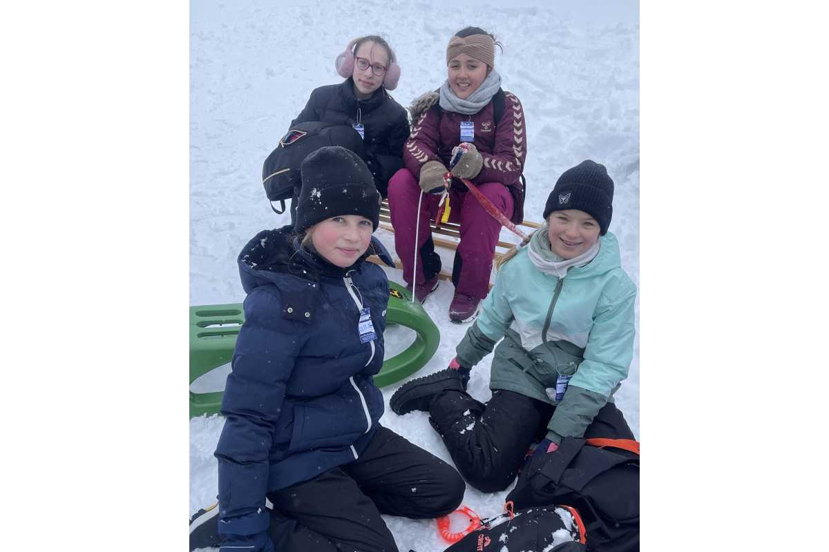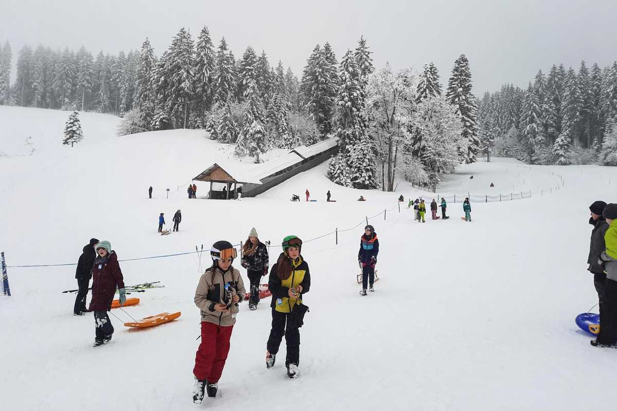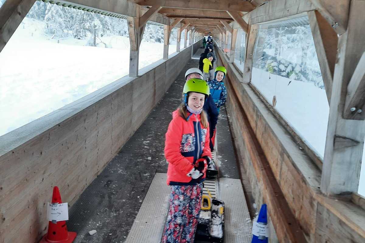 Die Klassen 5 und 6 waren an der Kalten Herberge. Dort konnten die Schülerinnen und Schüler zwischen Rodeln und Skifahren wählen. Dank des Förderbands kamen die Rodler ohne längere Fußwege schnell wieder nach oben.