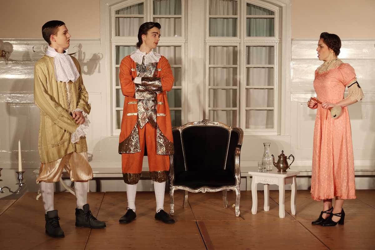 Regisseurin Sabine Milbradt hatte neun Monate lang mit Lehrer*innen und Schüler*innen der Zinzendorfschulen an Moliéres Komödie „Der Bürger als Edelmann“ gefeilt, am Freitag konnte das Ensemble im Kirchensaal eine vom Publikum bejubelte Premiere feiern. Sowohl in der Wahl des Spielortes als auch der Besetzung hatte die erfahrene Theaterfrau ein glückliches Händchen. Philipp Hudek glänzte facettenreich als ebenso eitle wie tragisch-lächerliche Titelfigur Jourdain, Laura Lindemann als seine deutlich geerdetere Gemahlin.