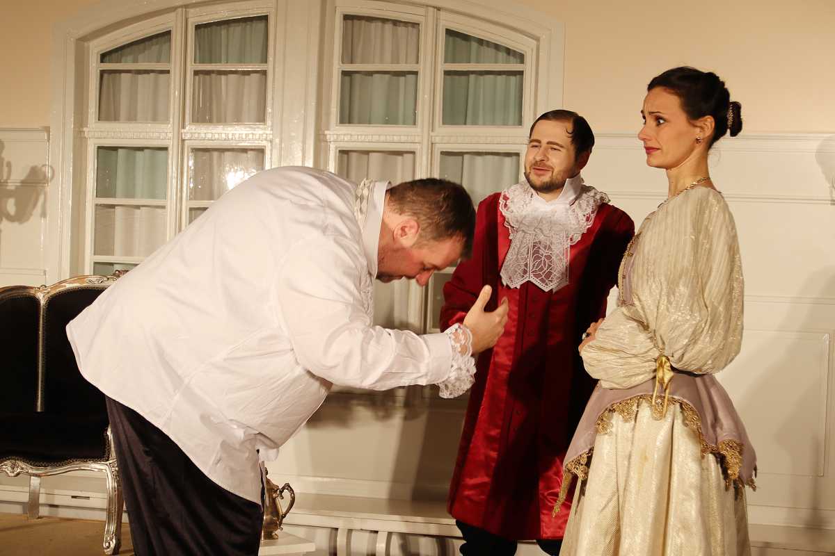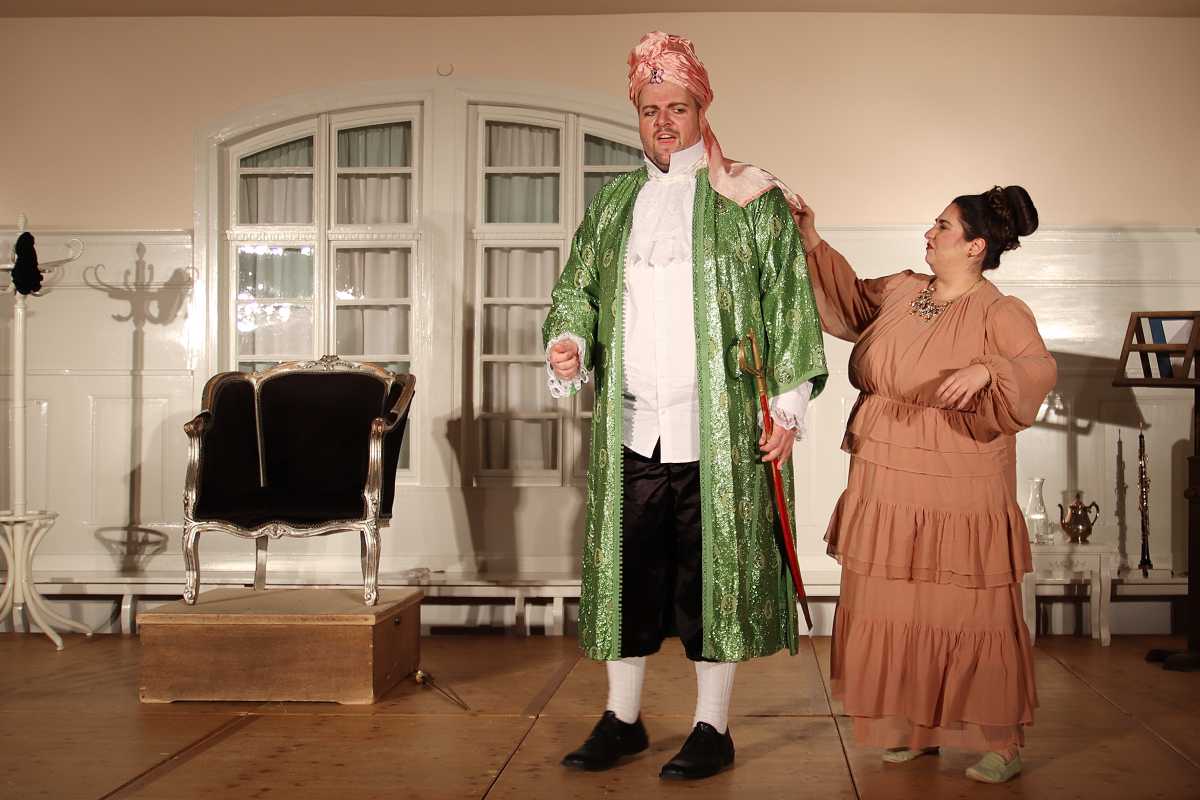 Um in adeligen Kreisen eine gute Figur zu machen, lässt sich Jourdain vom Musik- (Sabine Kuhner) und Fechtmeister (Katharina Wentzler) in deren Künste einweisen, vom Schneidermeister (Erdmuthe Terno) und seinem Gesellen (Anamaria Cabau) neue Gewänder anfertigen, von einer Sängerin (Irena Mohnkorn) unterhalten und vom Philosophen (Bernhard Hering) schulen. Dank seiner gut gefüllten Schatulle, die umgekehrt proportional zu seinen Talenten auf jeglichem Gebiet bemessen scheint, ist er für die Meister eine ebenso gute Einkommensquelle wie für den verarmten Grafen Doronte (Claudius Schiffer). Dieser gibt vor, für Herrn Jourdain den Weg ins Herz der Marquise Dorimène (Susanne Bühler) zu bahnen. Jedoch ist er dank der Geschenke von Jourdain dabei, dies für sich selbst zu erobern.