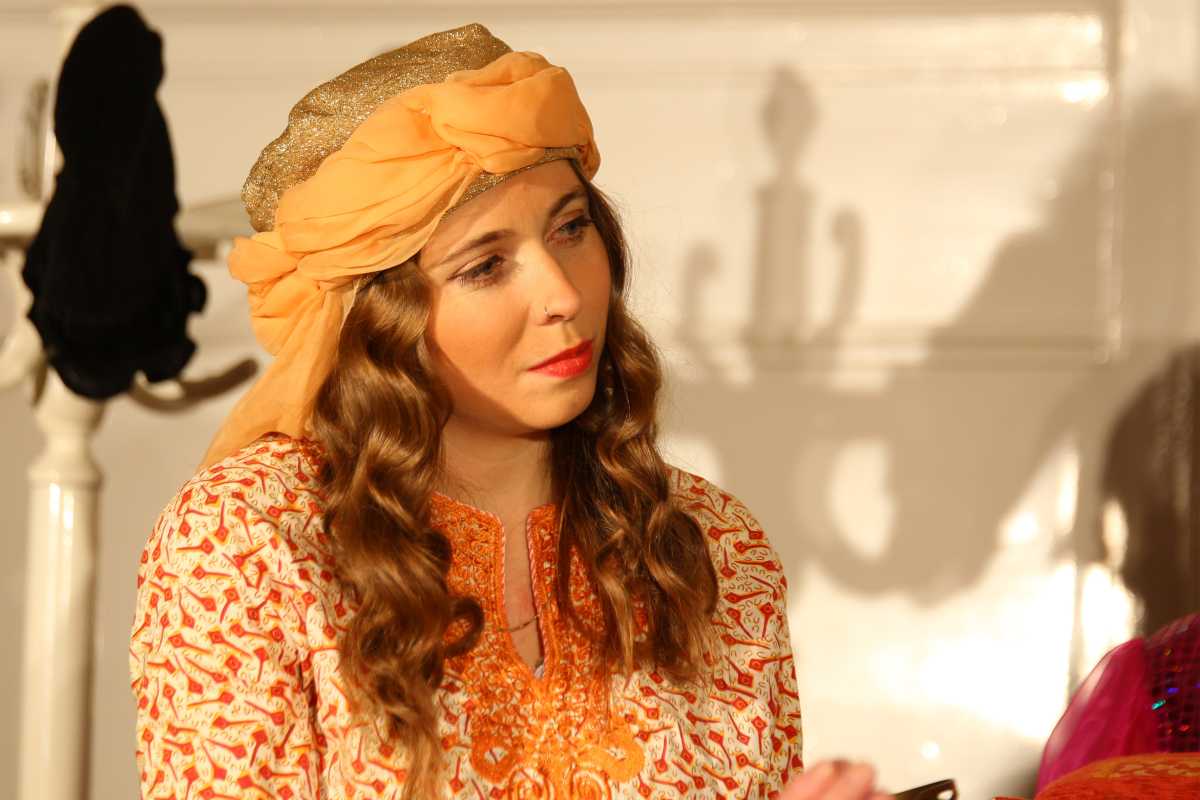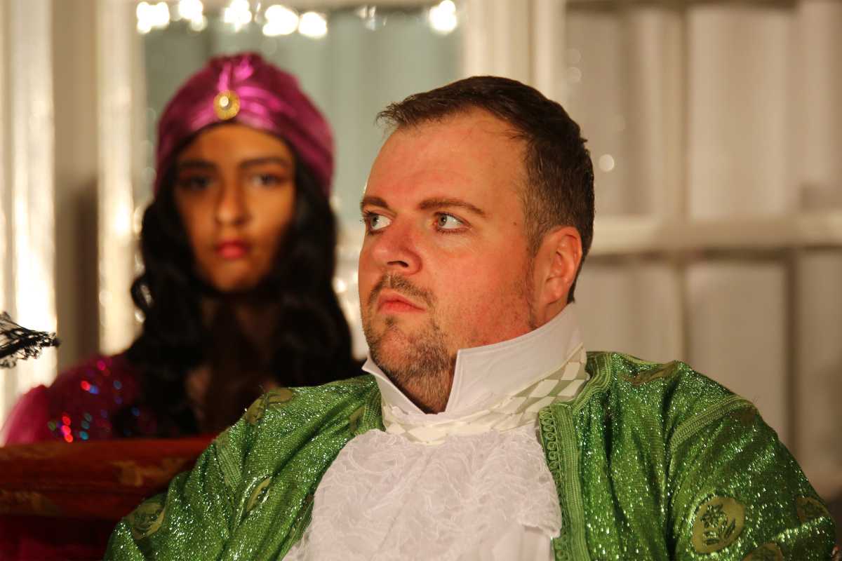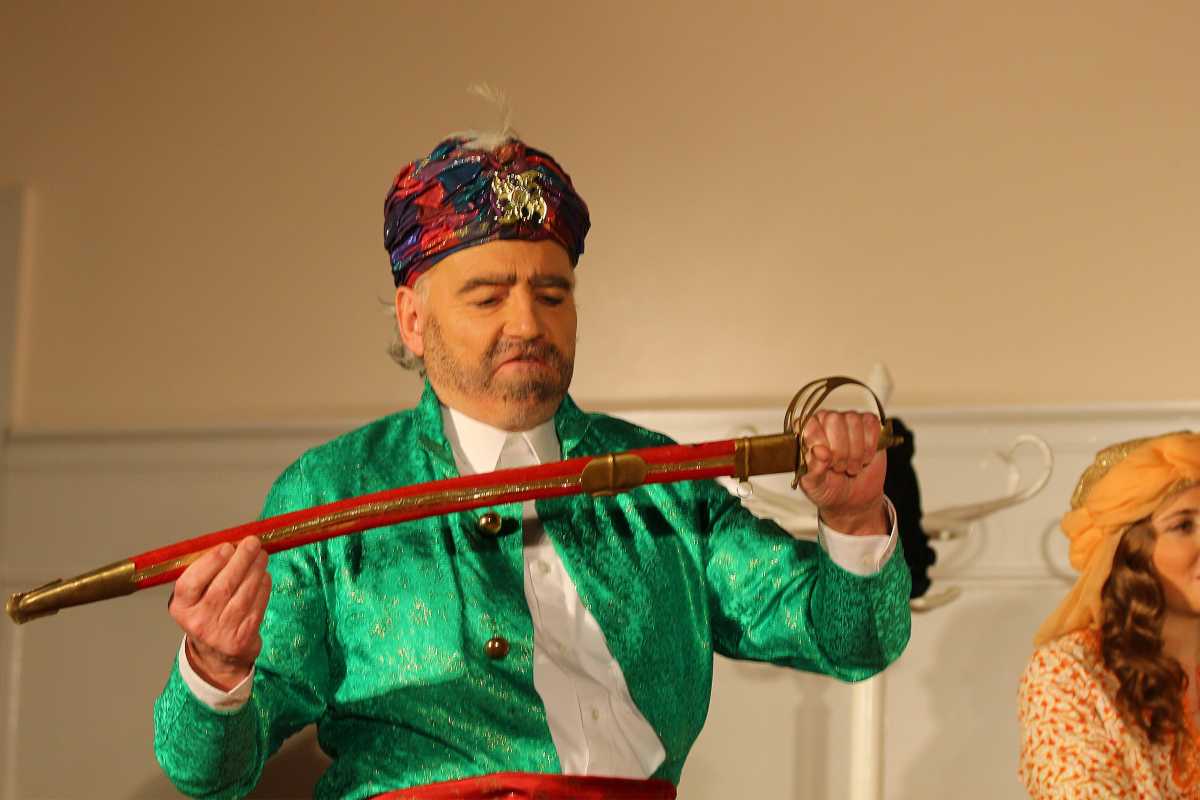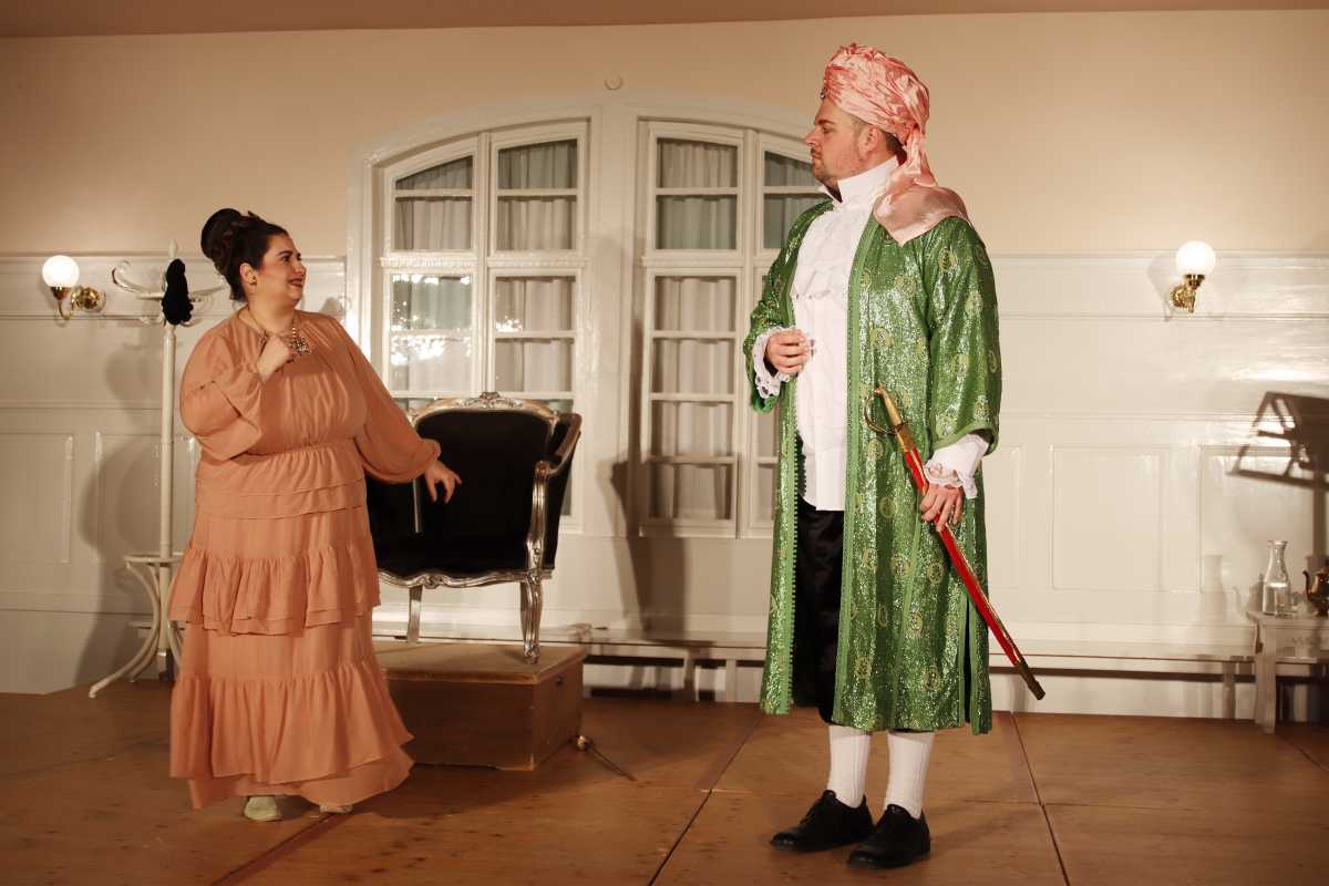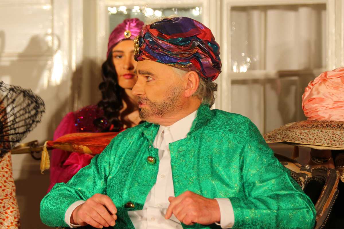 Natürlich kommt es für einen Herrn von edlem Geblüt, wie Jourdain es gerne wäre, nicht in Frage, seine Tochter (Lisa Menath) in die Hände eines schnöden, titellosen Kaufmannssohnes wie Cleonte (Moritz Borowski) zu geben. Es sollte schon mindestens ein Herzog oder Graf sein. Doch nichts leichter als das. Jourdain lässt sich von einem Mufti (Stephen Burrows) in einer ebenso spektakulären wie sinnfreien Zeremonie zum „Mamamouchi“ ernennen, während Cleonte als vorgeblicher Sohn des Großvisiers Jourdains Tochter ehelichen kann.