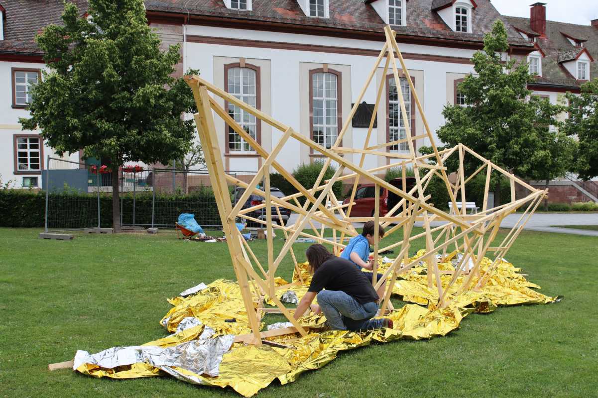 Im Kunstunterricht verschiedener Klassen entstand unter der Leitung von Anna Saurer und Mateusz Budasz zunächst ein Holzgerüst, das ursprünglich mit goldenen Rettungsdecken bespannt werden sollte. Doch während des kreativen Prozesses entschieden sich die Schülerinnen und Schüler um: Aus den schimmernden Folien wurde nicht etwa der Rumpf des Bootes, sondern das umgebende Wasser – eine symbolische Entscheidung, die die Bedeutung des Flüchtlingsboots als Hoffnungsort unterstreicht.