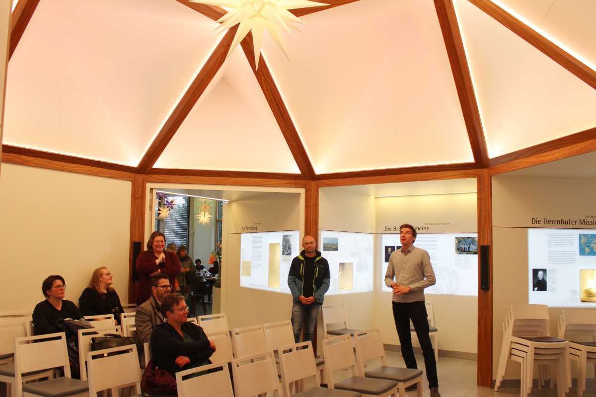 Besonders interessant für die Delegation aus Königsfeld war natürlich die Besichtigung des 2019 eingeweihten neuen Schulhauses der Zinzendorfschule Herrnhut. Dieses beeindruckte durch den spannenden Einsatz nachhaltiger Baustoffe, den Umgang mit bestimmten Bauverfahren und den daraus resultierenden Räumen zum Lehr-Lern-Begegnung. Die Klassenzimmer sind nach Orten benannt, die in der Brüdergemeine eine Rolle spielen – eines davon heißt Königsfeld. Auch die neue, im Bau befindliche Sporthalle stieß auf großes Interesse, vor allem wegen der Bauweise aus Vollholz.