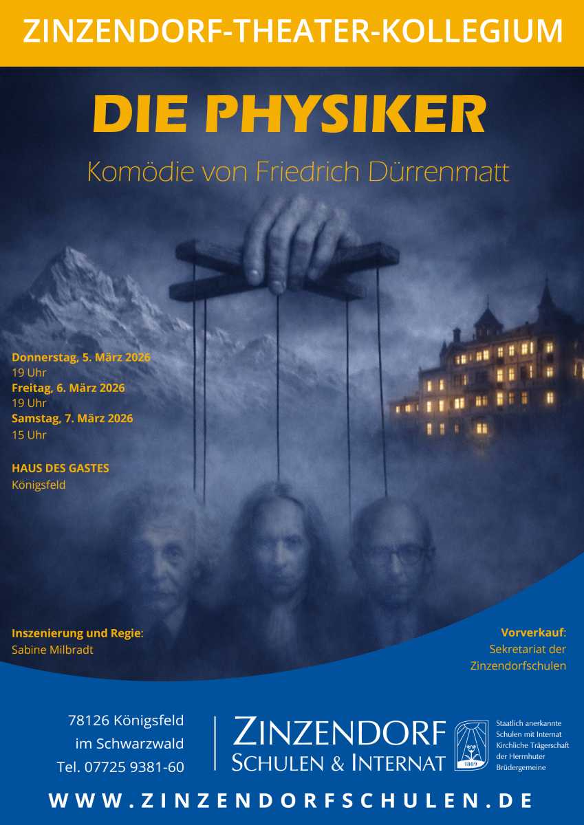 Erneut haben sich Lehrerinnen und Lehrer der Zinzendorfschulen als „Zinzendorf-Theater-Kollegium“ zusammengefunden und inszenieren unter der Regie von Sabine Milbradt ein Theaterstück. Die Komödie „Die Physiker“ von Friedrich Dürrenmatt ist Anfang März an drei Terminen im Haus des Gastes in Königsfeld zu sehen.